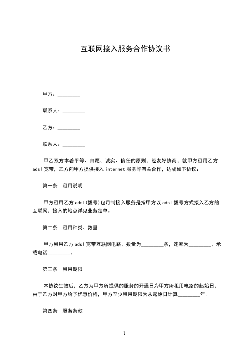 甲乙双方本着平等、自愿、诚实、信任的原则,经友好协商,就甲方租用乙方ADSL宽带,乙方向甲方提供接入INTERNET服务等有关合作,达成如下协议: