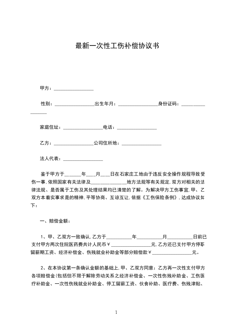 鉴于甲方于_______年____月____日在石家庄工地由于违反安全操作规程导致受伤一事,依照国家有关法律及_______________地方法规等有关规定,双方对相关的法律法规、是否属于工伤及其处理结果均已清楚的了解。为解决甲方工伤事宜,甲、乙双方本着实事求是的精神,平等协商、互谅互让,依据《工伤保险条例》,达成协议如下: