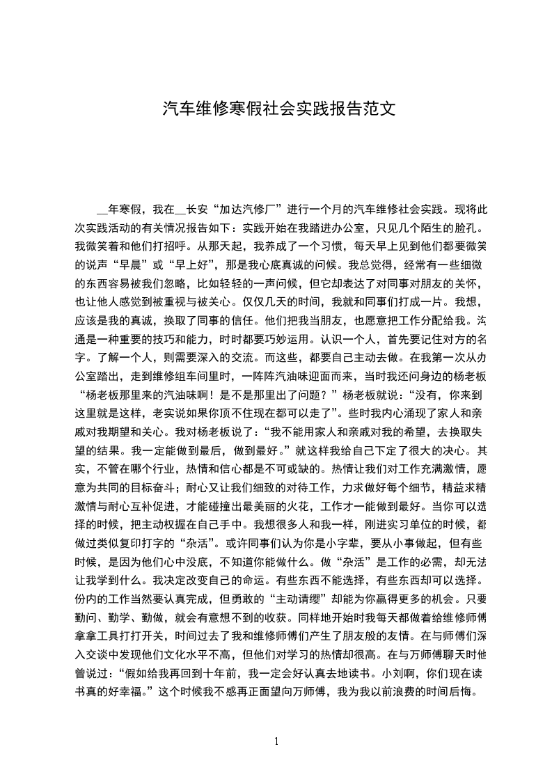 __年寒假,我在__长安“加达汽修厂”进行一个月的汽车维修社会实践。现将此次实践活动的有关情况报告如下: