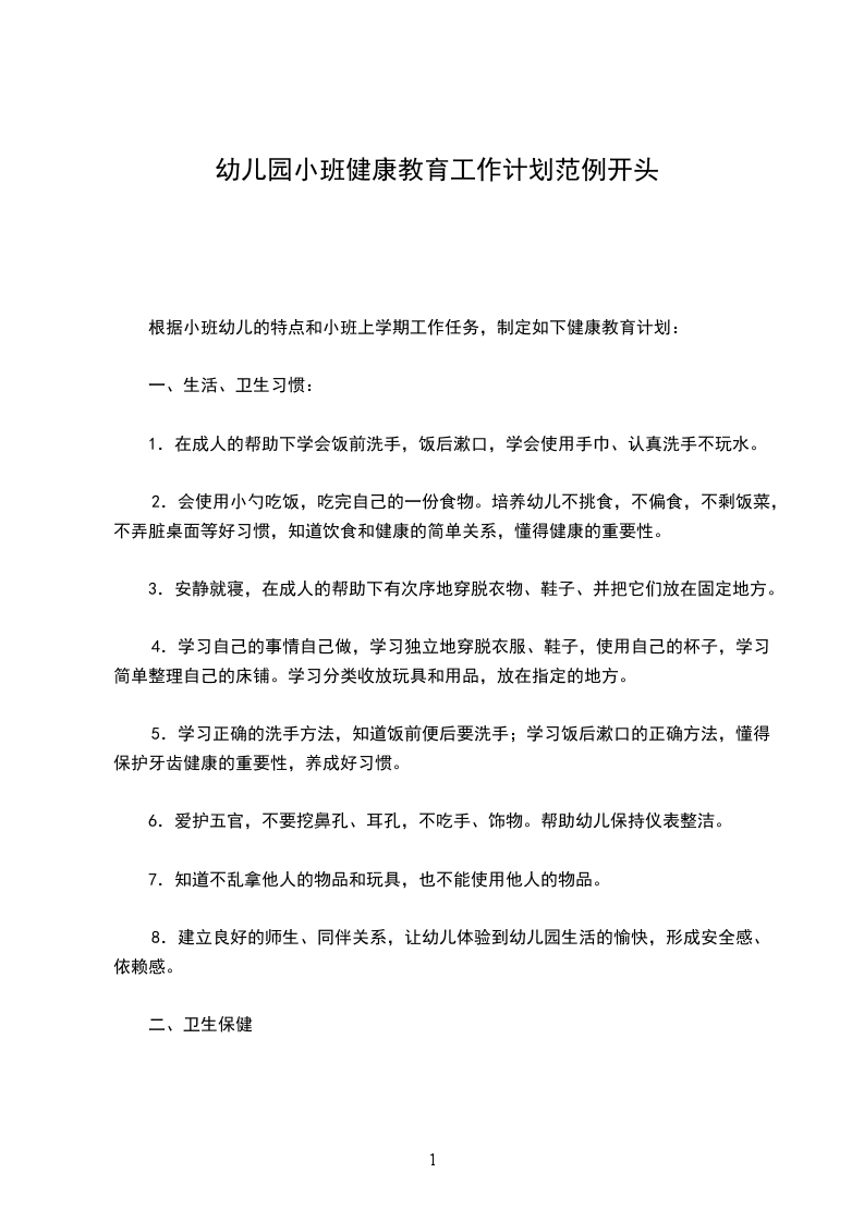 根据小班幼儿的特点和小班上学期工作任务,制定如下健康教育计划:
