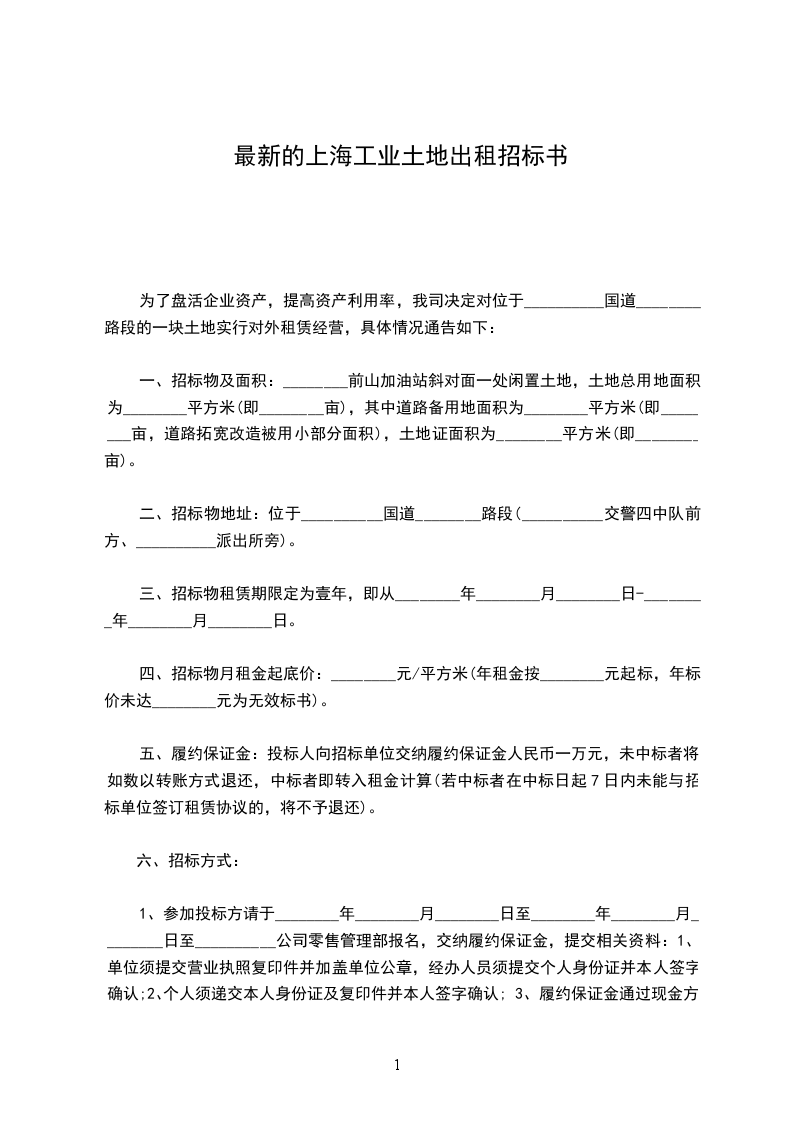 1、参加投标方请于________年________月________日至________年________月________日至__________公司零售管理部报名,交纳履约保证金,提交相关资料:1、单位须提交营业执照复印件并加盖单位公章,经办人员须提交个人身份证并本人签字确认;2、个人须递交本人身份证及复印件并本人签字确认;3、履约保证金通过现金方式于报名现场缴交。4、中标者需将租金通过转账方式转入我司账户(收款人:________有限公司__________分公司,开户行:________银行__________市分行营业部,帐号:___________________________)。