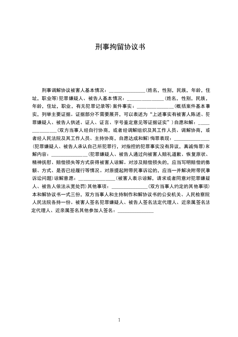 刑事调解协议被害人基本情况:_______________(姓名,性别,民族,年龄,住址,职业等)犯罪嫌疑人、被告人基本情况:_______________(姓名,性别,民族,年龄,住址,职业,有无犯罪记录等)案件事实:_______________(概括案件基本事实,列举主要证据。证据部分不需要展开,可以表述为“上述事实有被害人陈述、犯罪嫌疑人、被告人供述、证人、证言、字号鉴定意见等证据证实”)自愿和解:_______________(双方当事人经自行协商,或者经调解组织及其工作人员、调解协商,或者经人民法院及其工作人员、主持协商,自愿达成和解)悔罪表现:_______________(犯罪嫌疑人、被告人承认自己所犯罪行,对指控的犯罪事实没有异议,真诚悔罪)和解内容:_______________(犯罪嫌疑人、被告人通过向被害人赔礼道歉、恢复原状、精神抚慰、赔偿损失等方式获得被害人谅解。对涉及赔偿损失的,应当写明赔偿的数额、方式、是否已经履行等情况。对原提起附带民事诉讼的,应当一并解决附带民事诉讼问题)谅解意愿:_______________(被害人表示谅解,请求或者同意对犯罪嫌疑人、被告人依法从宽处罚)其他事项:_______________(双方当事人约定的其他事项)本和解协议书一式三份,双方当事人和主持制作和解协议书的公安机关、人民检察院、人民法院各持一份。被害人签名犯罪嫌疑人、被告人签名法定代理人、近亲属签名法定代理人、近亲属签名其他参加人签名:_______________
