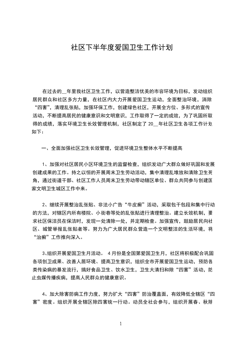 在过去的__年里我社区卫生工作,以营造整洁优美的市容环境为目标,发动组织居民群众和社区多方力量,在社区内大力开展爱国卫生运动,全面整治环境,消除“四害”,清理乱张贴,加强环保工作,创建绿色社区,开展全方位、多形式的宣传活动,不断提高居民的健康意识和文明意识,工作取得了一定的成效,为了巩固所取得的成绩,落实环境卫生长效管理机制,社区制定了20__年社区卫生各项工作计划如下: