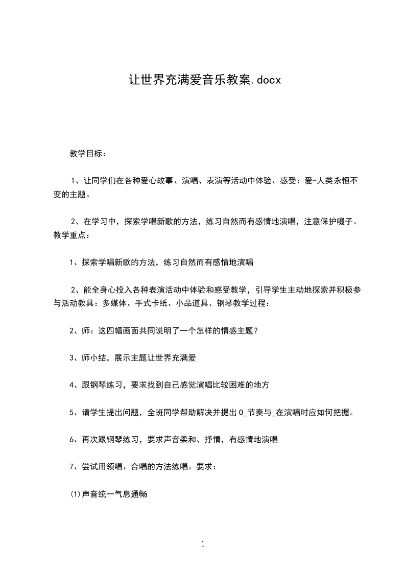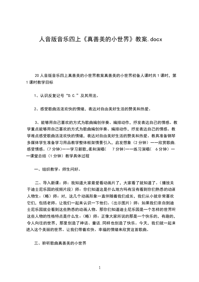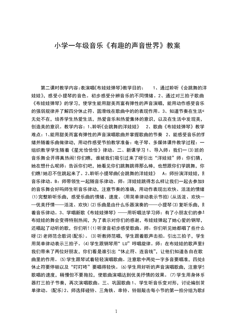 第二课时教学内容:表演唱《布娃娃弹琴》教学目的:1、通过聆听《会跳舞的洋娃娃》,感受小提琴的音色。初步感受分辨音乐的不同情绪。2、通过对三拍子歌曲《布娃娃弹琴》的学习,使学生能用甜美而富有弹性的声音演唱,能用动作感受音乐的强弱规律并了解四分休止符、圆滑线在歌曲中的的表现作用。3、知道节奏在生活中无处不在,培养学生热爱生活,热爱音乐和热爱集体的意识,以及在生活中发现美,创造美的意识。教学内容:1、聆听《会跳舞的洋娃娃》2、歌曲《布娃娃弹琴》教学难点:1、能用甜美而富有弹性的声音演唱歌曲并掌握歌曲的节奏2、能感受音乐的情绪并随着乐曲做律动,用动作感受节拍教学准备:电子琴、多媒体课件教学过程: