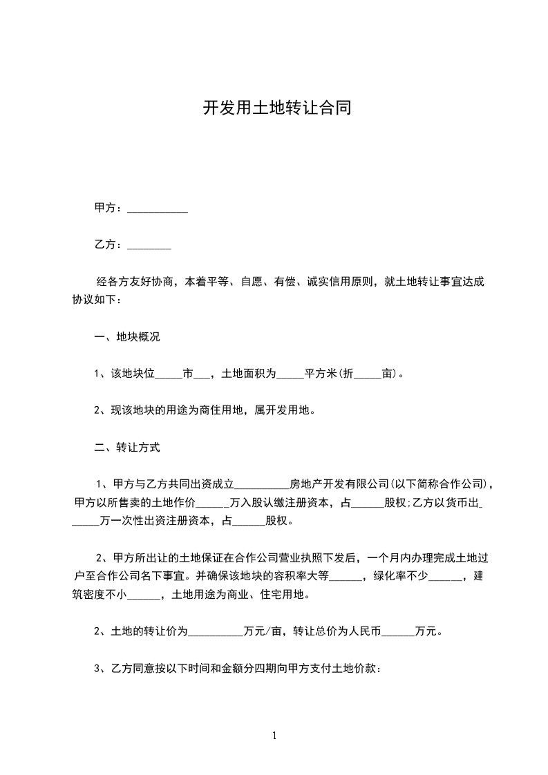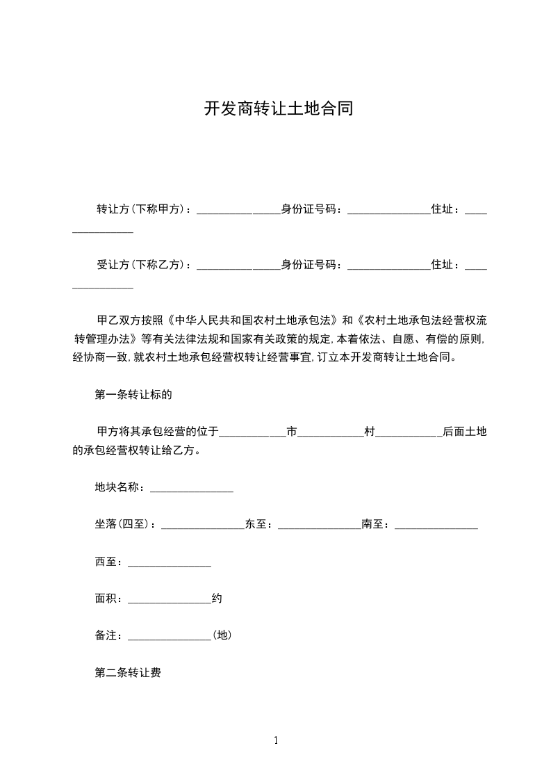 甲乙双方按照《中华人民共和国农村土地承包法》和《农村土地承包法经营权流转管理办法》等有关法律法规和国家有关政策的规定,本着依法、自愿、有偿的原则,经协商一致,就农村土地承包经营权转让经营事宜,订立本开发商转让土地合同。