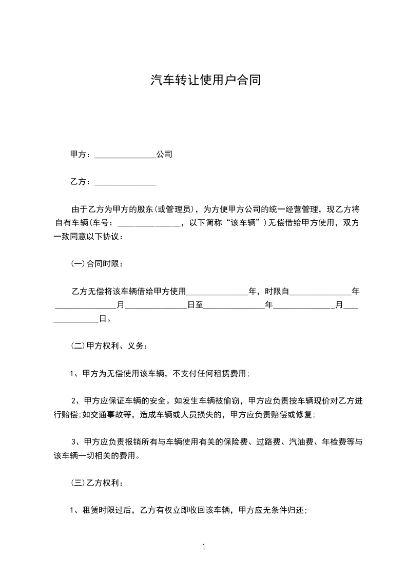 由于乙方为甲方的股东(或管理员),为方便甲方公司的统一经营管理,现乙方将自有车辆(车号:_______________,以下简称“该车辆”)无偿借给甲方使用,双方一致同意以下协议: