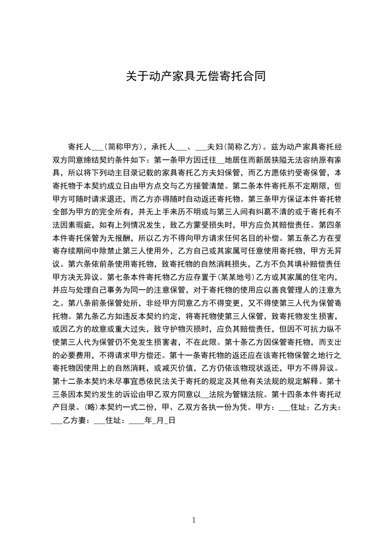 第一条甲方因迁往__地居住而新居狭隘无法容纳原有家具,所以将下列动主目录记载的家具寄托乙方夫妇保管,而乙方愿依约受寄保管,本寄托物于本契约成立日由甲方点交与乙方接管清楚。