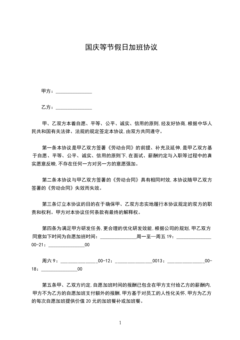 第四条为满足甲方研发任务,更合理的优化研发效能,根据公司的规划,甲乙双方同意如下时间为自愿加班时间:_______________周一至—周五19:_______________00-21:_______________00