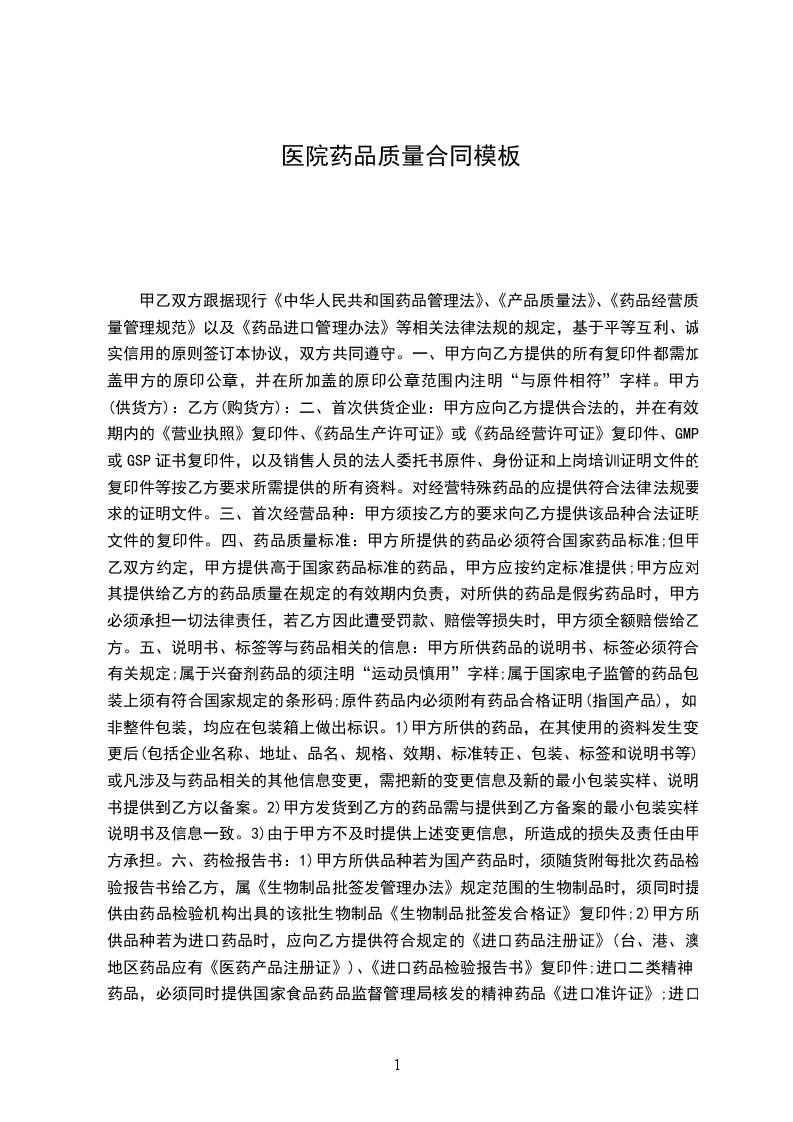 甲方所提供的药品必须符合国家药品标准;但甲乙双方约定,甲方提供高于国家药品标准的药品,甲方应按约定标准提供;甲方应对其提供给乙方的药品质量在规定的有效期内负责,对所供的药品是假劣药品时,甲方必须承担一切法律责任,若乙方因此遭受罚款、赔偿等损失时,甲方须全额赔偿给乙方。
