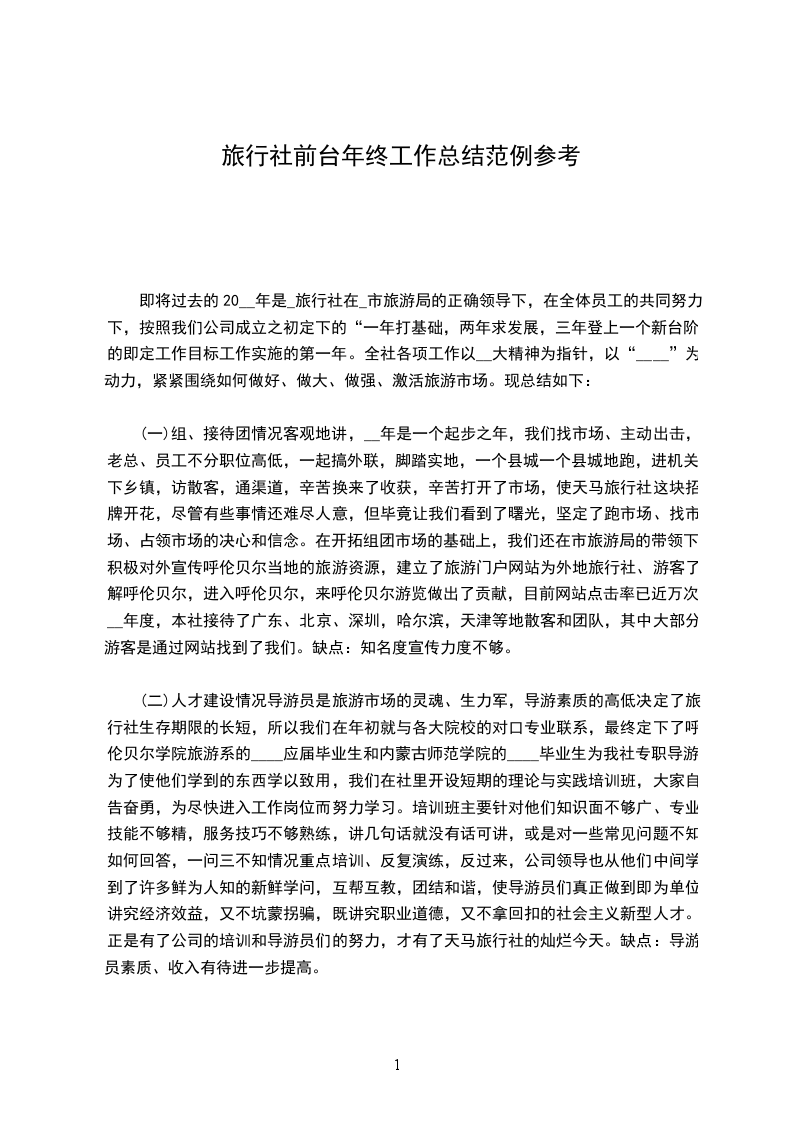 (一)组、接待团情况客观地讲,__年是一个起步之年,我们找市场、主动出击,老总、员工不分职位高低,一起搞外联,脚踏实地,一个县城一个县城地跑,进机关,下乡镇,访散客,通渠道,辛苦换来了收获,辛苦打开了市场,使天马旅行社这块招牌开花,尽管有些事情还难尽人意,但毕竟让我们看到了曙光,坚定了跑市场、找市场、占领市场的决心和信念。在开拓组团市场的基础上,我们还在市旅游局的带领下,积极对外宣传呼伦贝尔当地的旅游资源,建立了旅游门户网站为外地旅行社、游客了解呼伦贝尔,进入呼伦贝尔,来呼伦贝尔游览做出了贡献,目前网站点击率已近万次。__年度,本社接待了广东、北京、深圳,哈尔滨,天津等地散客和团队,其中大部分游客是通过网站找到了我们。缺点:知名度宣传力度不够。