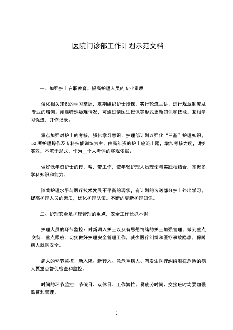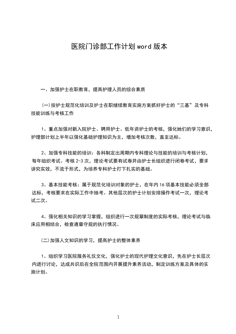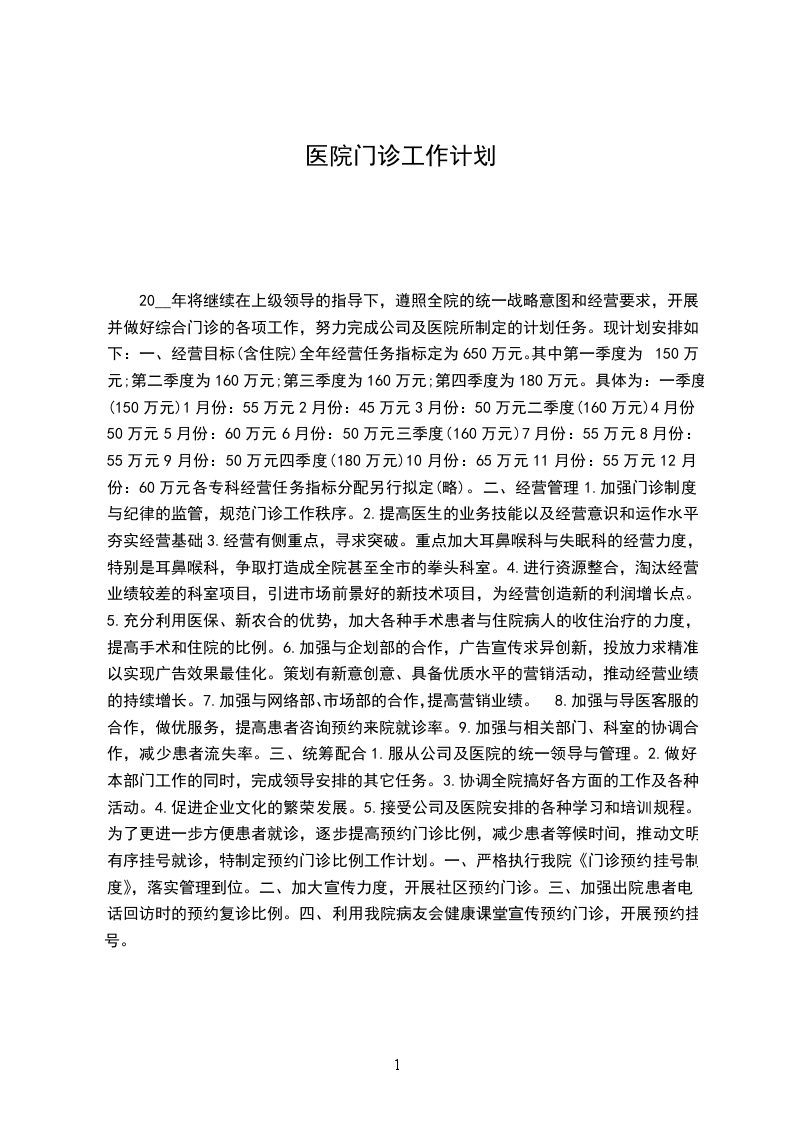 20__年将继续在上级领导的指导下,遵照全院的统一战略意图和经营要求,开展并做好综合门诊的各项工作,努力完成公司及医院所制定的计划任务。现计划安排如下:一、经营目标(含住院)全年经营任务指标定为650万元。其中第一季度为150万元;第二季度为160万元;第三季度为160万元;第四季度为180万元。具体为:一季度(150万元)1月份:55万元2月份:45万元3月份:50万元二季度(160万元)4月份:50万元5月份:60万元6月份:50万元三季度(160万元)7月份:55万元8月份:55万元9月份:50万元四季度(180万元)10月份:65万元11月份:55万元12月份:60万元各专科经营任务指标分配另行拟定(略)。二、经营管理1.加强门诊制度与纪律的监管,规范门诊工作秩序。2.提高医生的业务技能以及经营意识和运作水平,夯实经营基础3.经营有侧重点,寻求突破。重点加大耳鼻喉科与失眠科的经营力度,特别是耳鼻喉科,争取打造成全院甚至全市的拳头科室。4.进行资源整合,淘汰经营业绩较差的科室项目,引进市场前景好的新技术项目,为经营创造新的利润增长点。5.充分利用医保、新农合的优势,加大各种手术患者与住院病人的收住治疗的力度,提高手术和住院的比例。6.加强与企划部的合作,广告宣传求异创新,投放力求精准,以实现广告效果最佳化。策划有新意创意、具备优质水平的营销活动,推动经营业绩的持续增长。7.加强与网络部、市场部的合作,提高营销业绩。8.加强与导医客服的合作,做优服务,提高患者咨询预约来院就诊率。9.加强与相关部门、科室的协调合作,减少患者流失率。三、统筹配合1.服从公司及医院的统一领导与管理。2.做好本部门工作的同时,完成领导安排的其它任务。3.协调全院搞好各方面的工作及各种活动。4.促进企业文化的繁荣发展。5.接受公司及医院安排的各种学习和培训规程。为了更进一步方便患者就诊,逐步提高预约门诊比例,减少患者等候时间,推动文明有序挂号就诊,特制定预约门诊比例工作计划。一、严格执行我院《门诊预约挂号制度》,落实管理到位。二、加大宣传力度,开展社区预约门诊。三、加强出院患者电话回访时的预约复诊比例。四、利用我院病友会健康课堂宣传预约门诊,开展预约挂号。