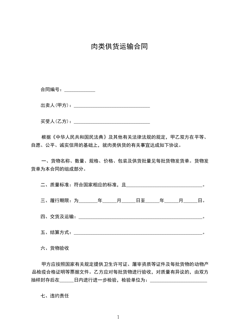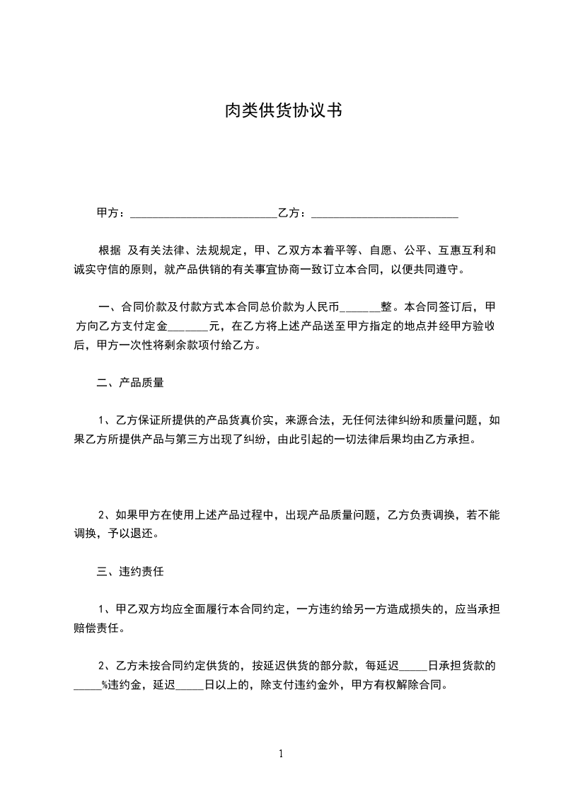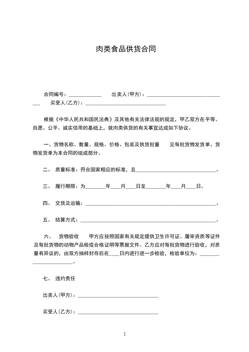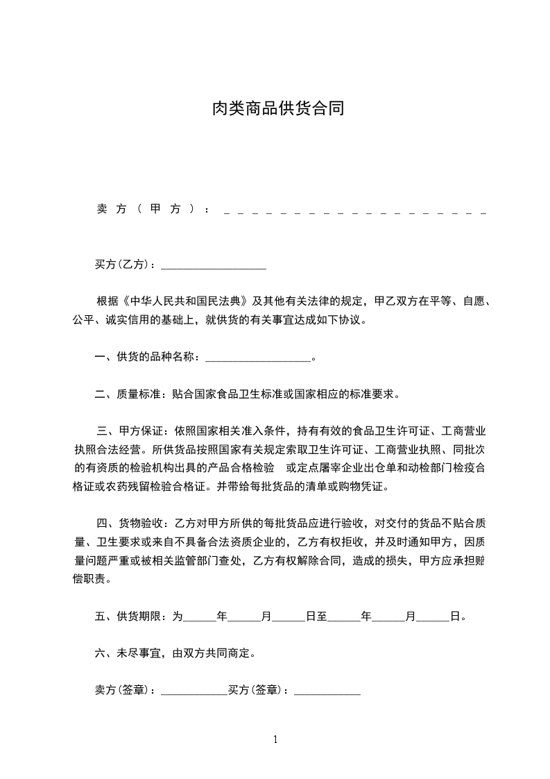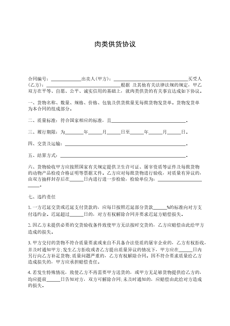 根据《中华人民共和国民法典》及其他有关法律法规的规定,甲乙双方在平等、自愿、公平、诚实信用的基础上,就肉类供货的有关事宜达成如下协议。