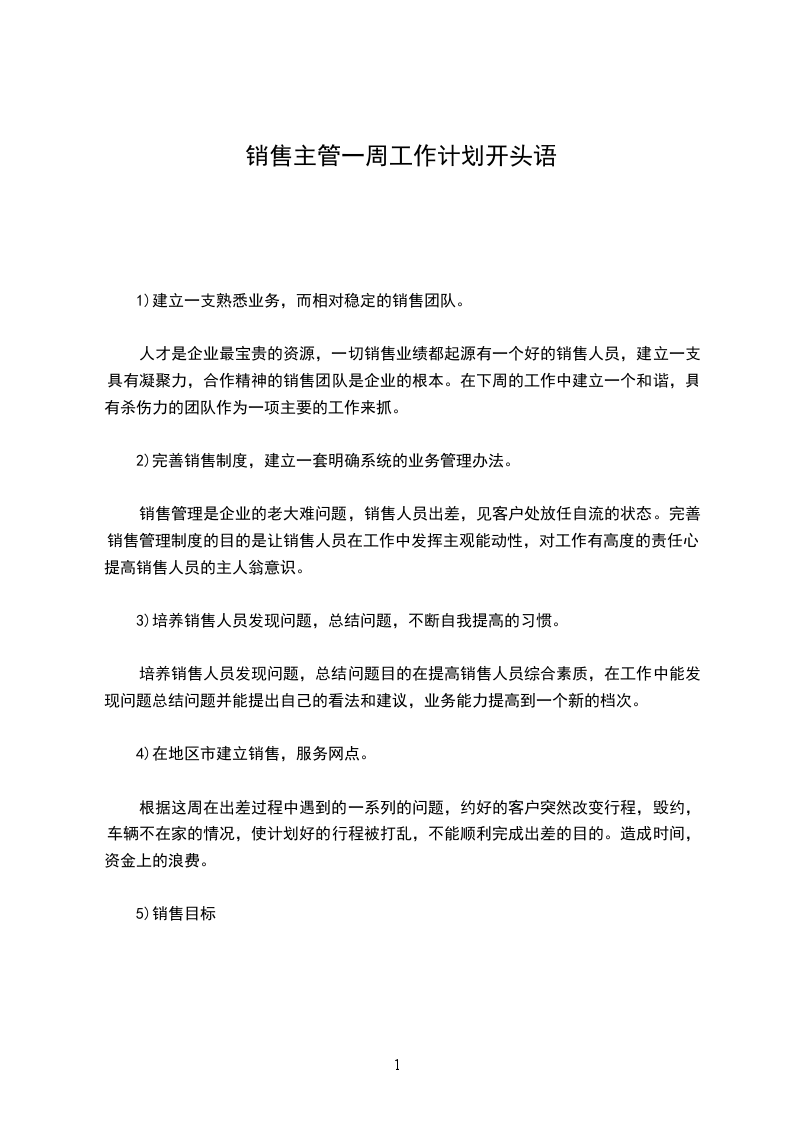 人才是企业最宝贵的资源,一切销售业绩都起源有一个好的销售人员,建立一支具有凝聚力,合作精神的销售团队是企业的根本。在下周的工作中建立一个和谐,具有杀伤力的团队作为一项主要的工作来抓。