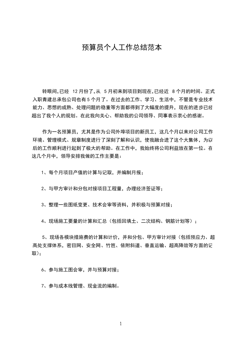 二、严格按照公司及部门的各项规章制度,按时保质地完成公司安排的各项工作。进入公司以来,在领导及同事的支持与帮助下,参与完成了邹城市泉兴家园工程的预算投标工作,独立完成了_____住宅楼工程、___工程,__以及其他各项工程的预算和投标工作;积极参与了公司的投标报名及开标工作。通过亲身参与预算工作的整个过程,使自己对预算有了初步的了解,加深了对预算概念的认识,从而对预算这项工作有了更深的了解。