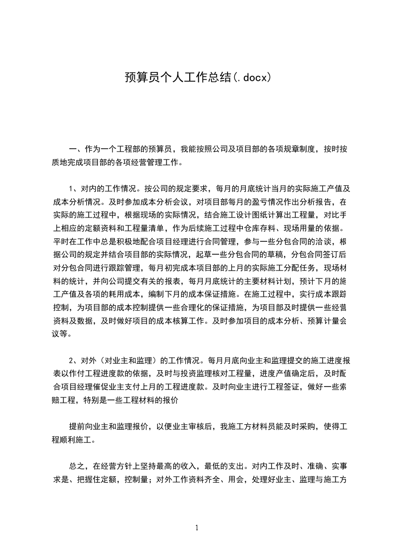 一、认真学习业务技能,积极投身预算工作。具备良好的政治和业务素质是做好本职工作的前提和必要条件。作为一名预算员,在工程预算这个领域里,我是一个新人,对所从事行业的认识也比较肤浅,为了提升自身的素质,快速适应企业环境和工作岗位,我能勤学好问,积极向同事学习取经,在公司领导和同事的信任和帮助下,不断提高业务技能,尽快适应工作岗位需要,在短时间内迅速融合进了这个大集体,为以后的工作顺利开展奠定了基础。