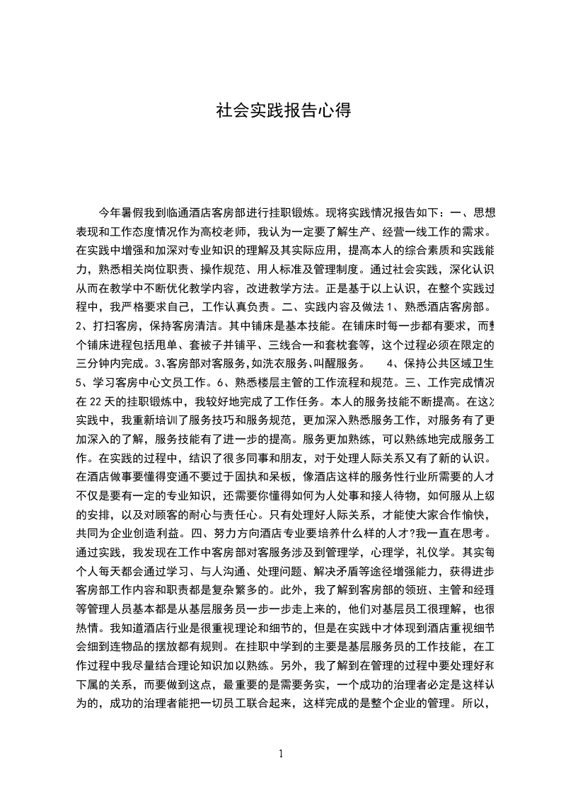 今年暑假我到临通酒店客房部进行挂职锻炼。现将实践情况报告如下: