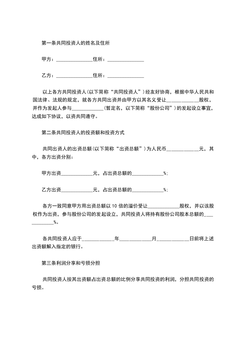 以上各方共同投资人(以下简称“共同投资人”)经友好协商,根据中华人民共和国法律、法规的规定,就各方共同出资并由甲方以其名义受让_____________股权,并作为发起人参与_____________(暂定名,以下简称“股份公司”)的发起设立事宜,达成如下协议,以资共同遵守。