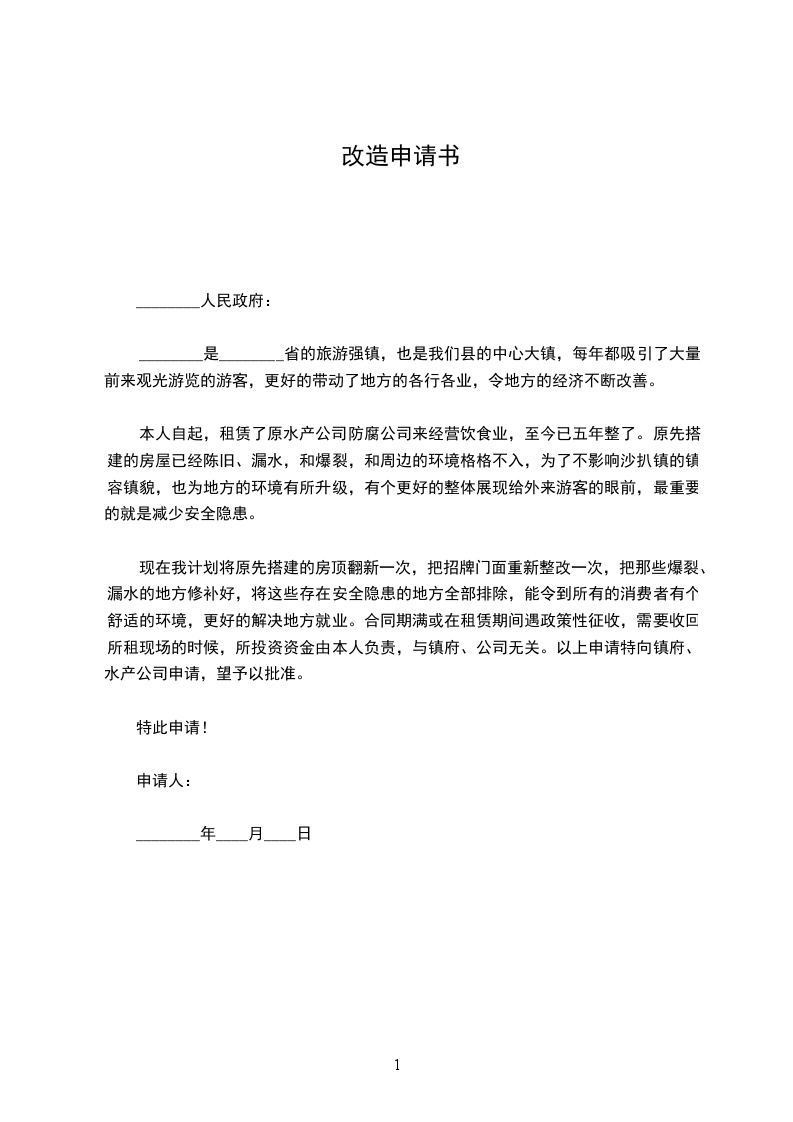 现在我计划将原先搭建的房顶翻新一次,把招牌门面重新整改一次,把那些爆裂、漏水的地方修补好,将这些存在安全隐患的地方全部排除,能令到所有的消费者有个舒适的环境,更好的解决地方就业。合同期满或在租赁期间遇政策性征收,需要收回所租现场的时候,所投资资金由本人负责,与镇府、公司无关。以上申请特向镇府、水产公司申请,望予以批准。