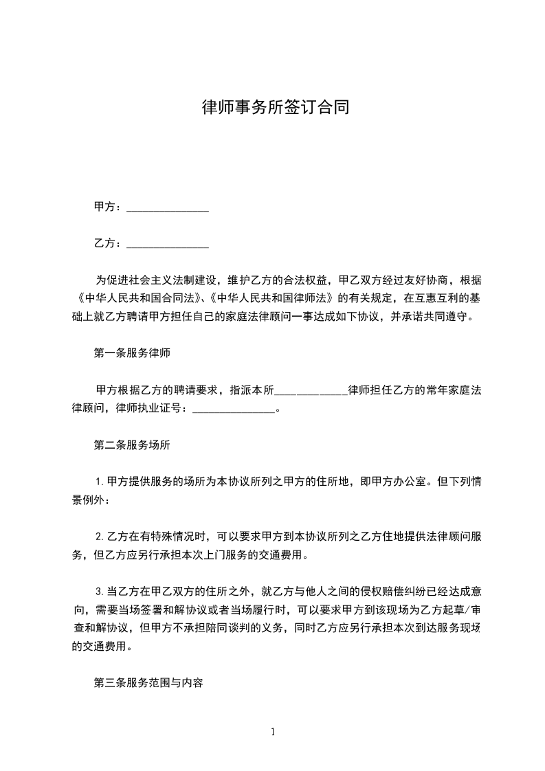 甲方根据乙方的聘请要求,指派本所_____________律师担任乙方的常年家庭法律顾问,律师执业证号:_______________。