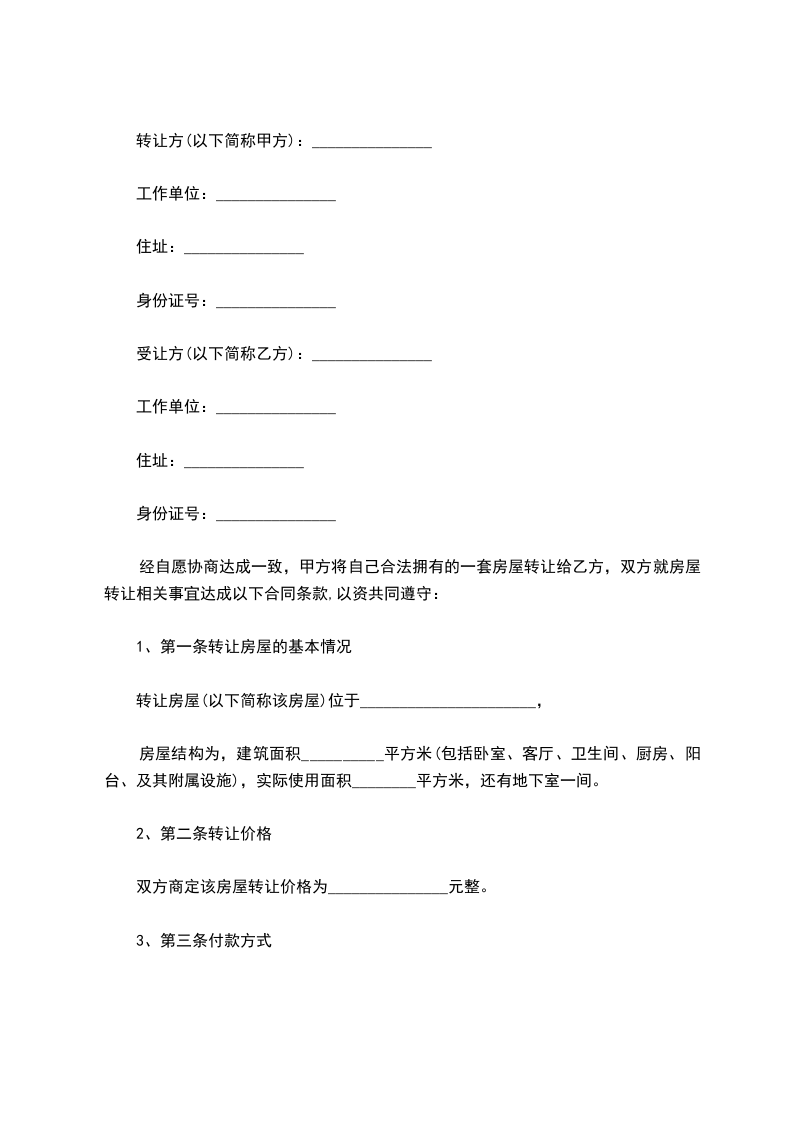 经自愿协商达成一致,甲方将自己合法拥有的一套房屋转让给乙方,双方就房屋转让相关事宜达成以下合同条款,以资共同遵守:
