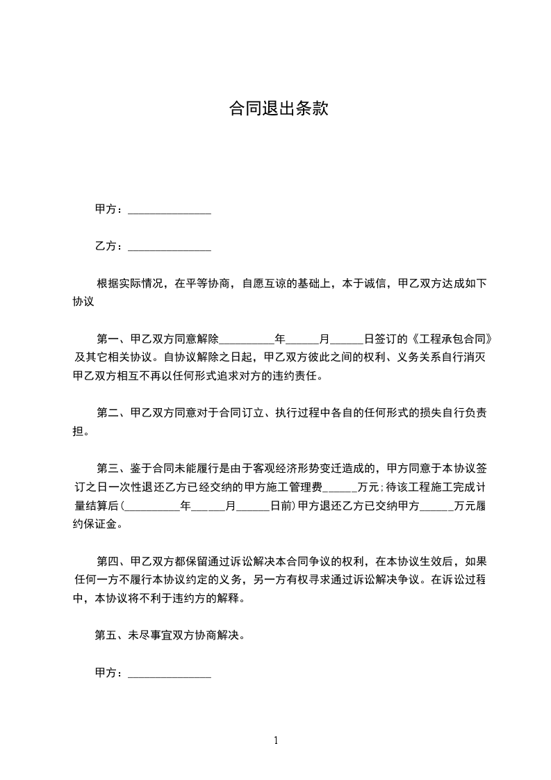 第一、甲乙双方同意解除__________年______月______日签订的《工程承包合同》及其它相关协议。自协议解除之日起,甲乙双方彼此之间的权利、义务关系自行消灭。甲乙双方相互不再以任何形式追求对方的违约责任。