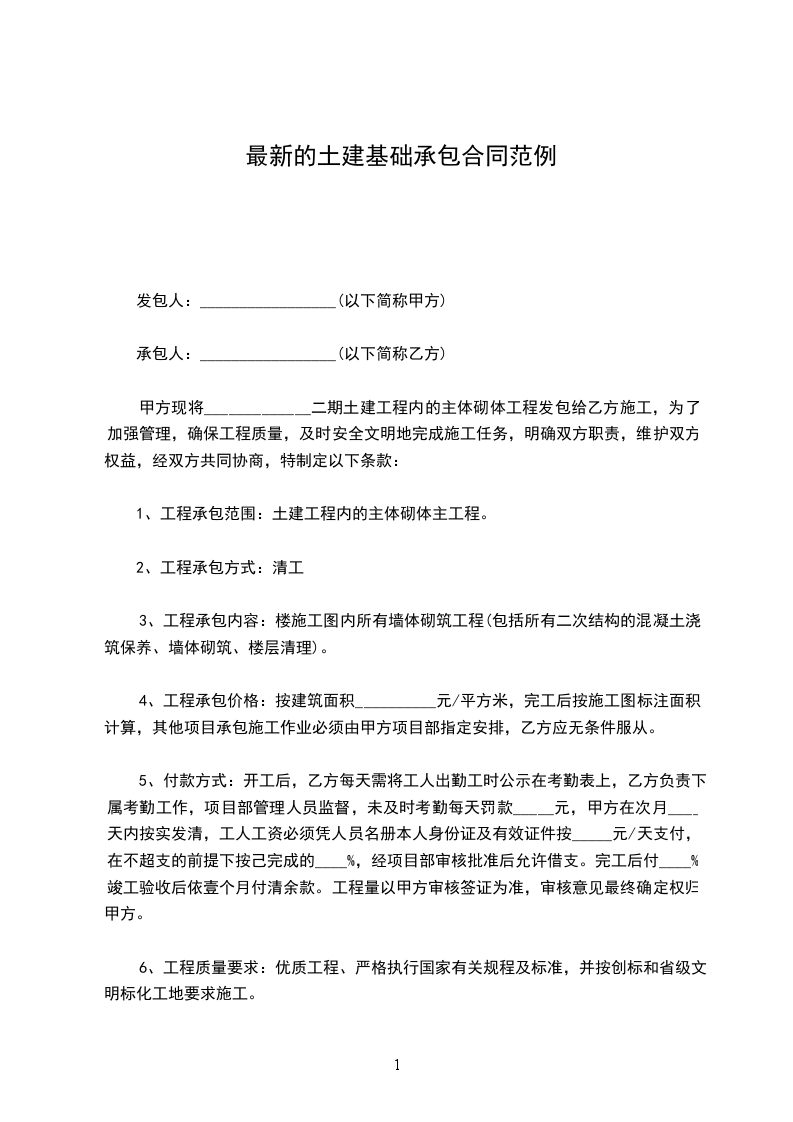 甲方现将_____________二期土建工程内的主体砌体工程发包给乙方施工,为了加强管理,确保工程质量,及时安全文明地完成施工任务,明确双方职责,维护双方权益,经双方共同协商,特制定以下条款: