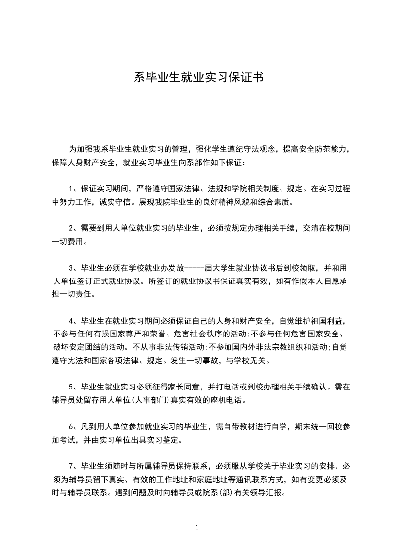 为加强我系毕业生就业实习的管理,强化学生遵纪守法观念,提高安全防范能力,保障人身财产安全,就业实习毕业生向系部作如下保证: