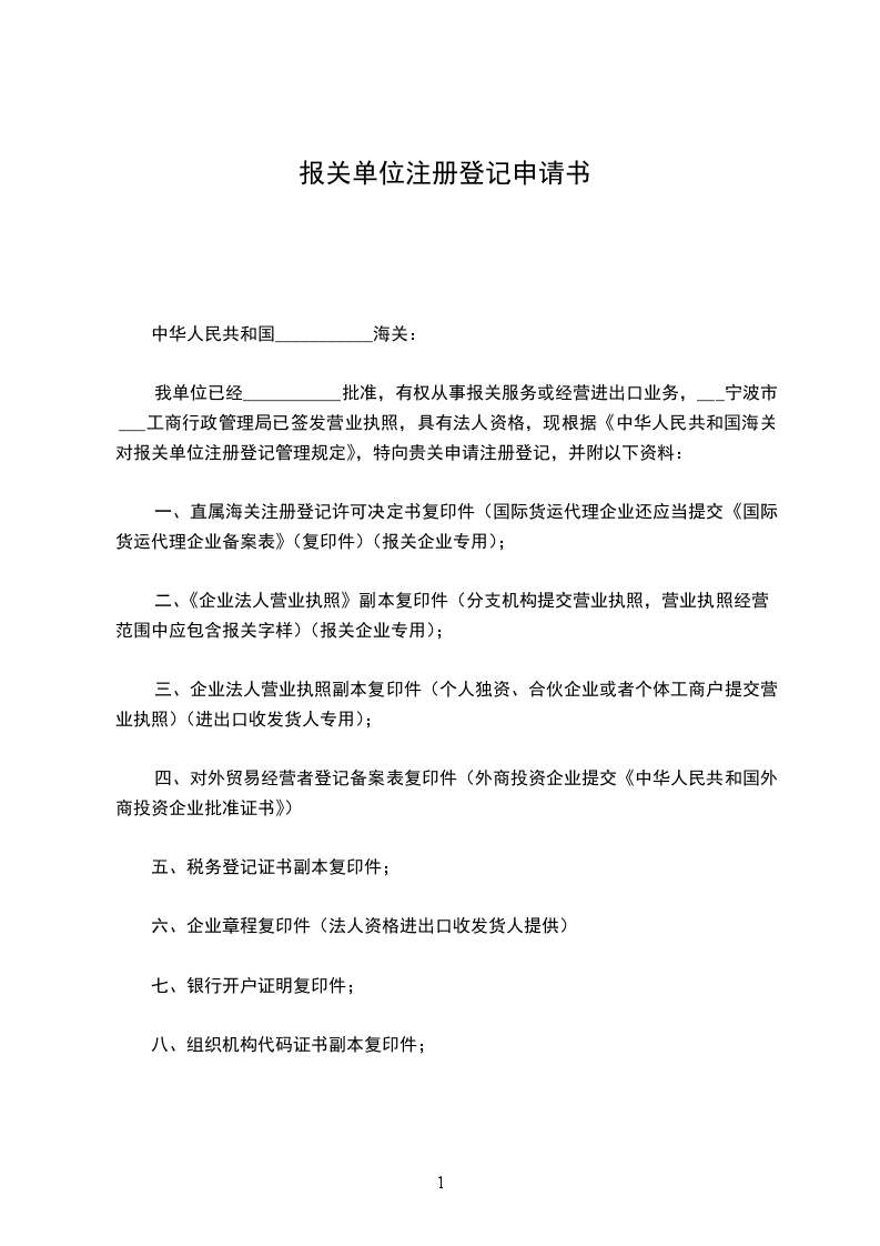 我单位已经___________批准,有权从事报关服务或经营进出口业务,___宁波市___工商行政管理局已签发营业执照,具有法人资格,现根据《中华人民共和国海关对报关单位注册登记管理规定》,特向贵关申请注册登记,并附以下资料:
