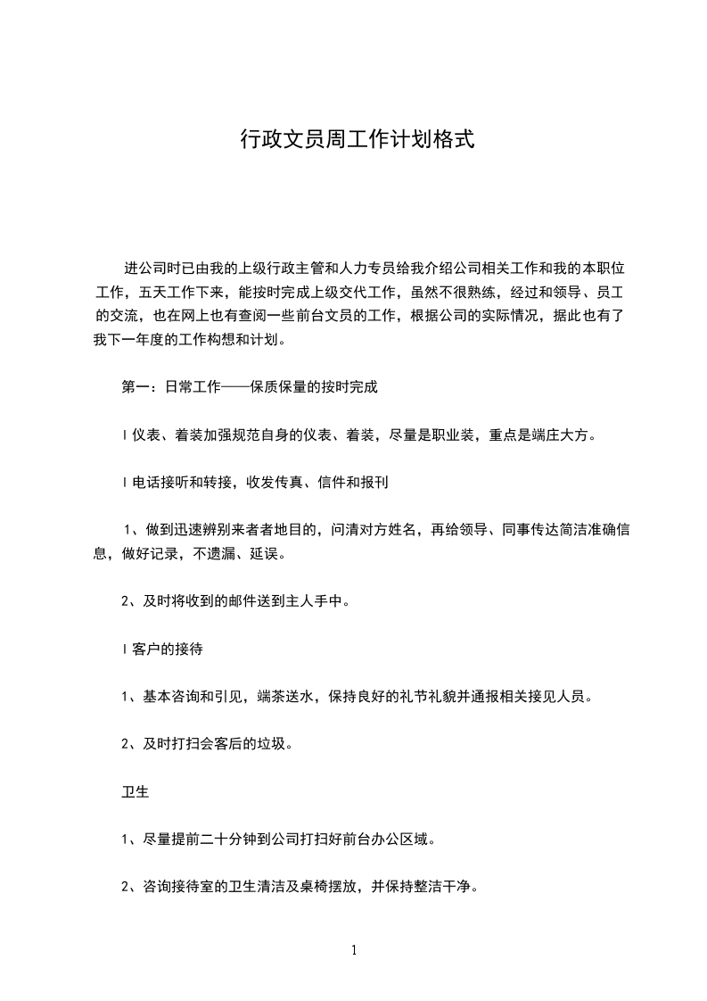 进公司时已由我的上级行政主管和人力专员给我介绍公司相关工作和我的本职位工作,五天工作下来,能按时完成上级交代工作,虽然不很熟练,经过和领导、员工的交流,也在网上也有查阅一些前台文员的工作,根据公司的实际情况,据此也有了我下一年度的工作构想和计划。
