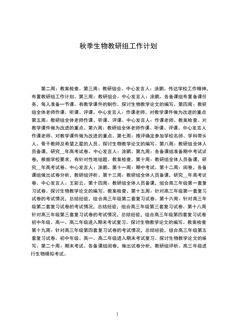 第二周:教案检查。第三周:教研组会。中心发言人:涂鹏。传达学校工作精神,布置教研组工作计划。第三周:教研组会。中心发言人:涂鹏。各备课组布置备课任务,每人准备一节课。有教学课件的制作。探讨生物教学论文的编写。第四周:教研组全体老师作课、听课、评课。中心发言人:作课老师。对教学课件做为改进的重点。第五周:教研组全体老师作课、听课、评课。中心发言人:作课老师。教案检查。对教学课件做为改进的重点。第六周:教研组全体老师作课、听课、评课。中心发言人:作课老师。对教学课件做为改进的重点。第七周:推评确定参加学校名师、学科带头人、骨干教师及希望之星的人员。探讨生物教学论文的编写。第八周:教研组全体人员备课,研究__年高考试卷。中心发言人:涂鹏。第九周:各备课组准备期中考试试卷,根据学校要求,有针对性地组题。教案检查。第十周:教研组全体人员备课,研究__年高考试卷。中心发言人:涂鹏。第十一周:期中考试。第十二周:阅卷,各备课组做出试卷分析,教研组评析。第十三周:教研组全体人员备课,研究__年高考试卷。中心发言人:王彩云。第十四周:教研组全体人员备课,组合高三年级第一套复习试卷。探讨生物教学论文的编写。教案检查。第十五周:针对高三年级第一套复习试卷的考试情况,总结经验,组合高三年级第二套复习试卷。第十六周:针对高三年级第二套复习试卷的考试情况,总结经验,组合高三年级第三套复习试卷。第十八周:针对高三年级第三套复习试卷的考试情况,总结经验,组合高三年级第四套复习试卷。初中年级、高一、高二年级进入期末考试复习。探讨生物教学论文的编写。教案检查。第十九周:针对高三年级第四套复习试卷的考试情况,总结经验,组合高三年级第五套复习试卷。初中年级、高一、高二年级进入期末考试复习。探讨生物教学论文的编写。第二十周:期末考试。各备课组阅卷,做出试卷分析,教研组评析。高三年级进行生物模拟考试。