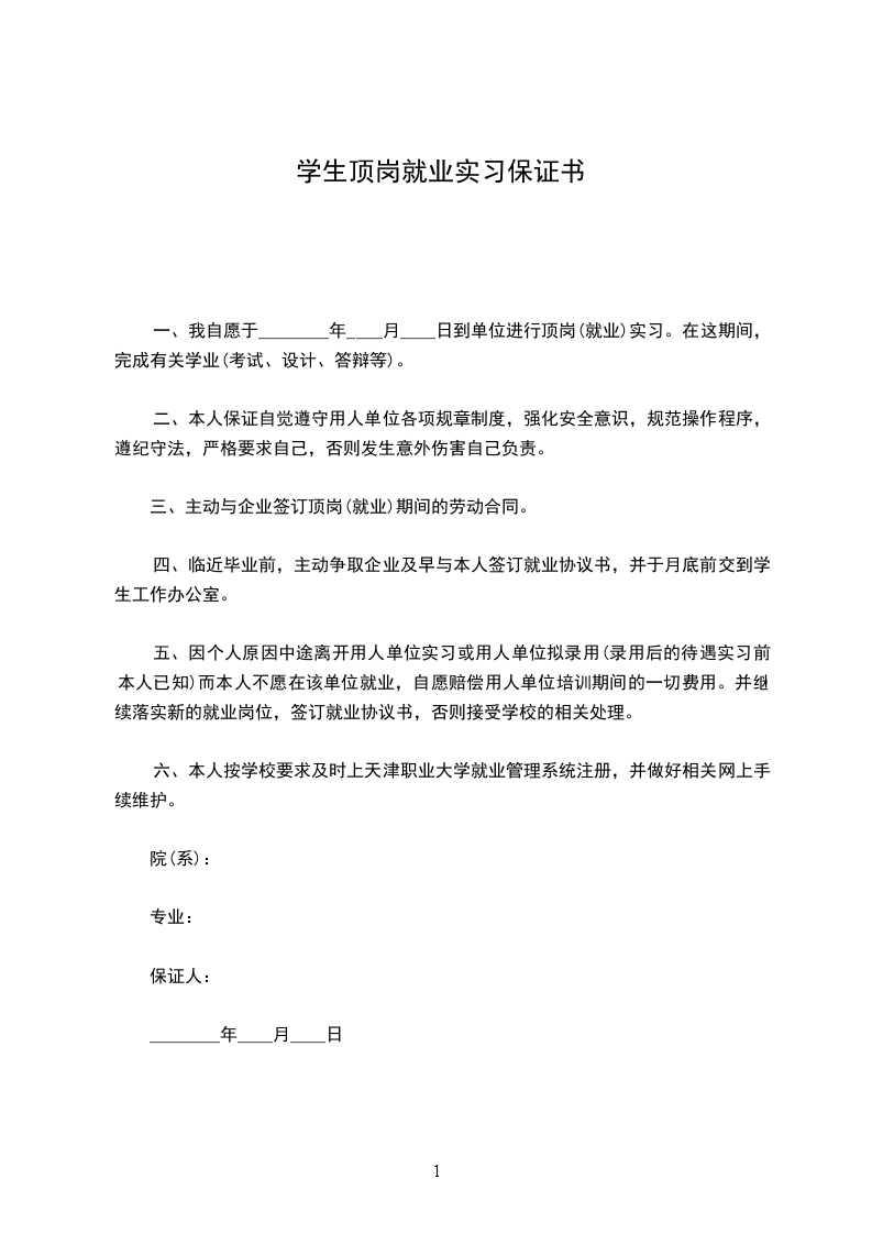 五、因个人原因中途离开用人单位实习或用人单位拟录用(录用后的待遇实习前本人已知)而本人不愿在该单位就业,自愿赔偿用人单位培训期间的一切费用。并继续落实新的就业岗位,签订就业协议书,否则接受学校的相关处理。