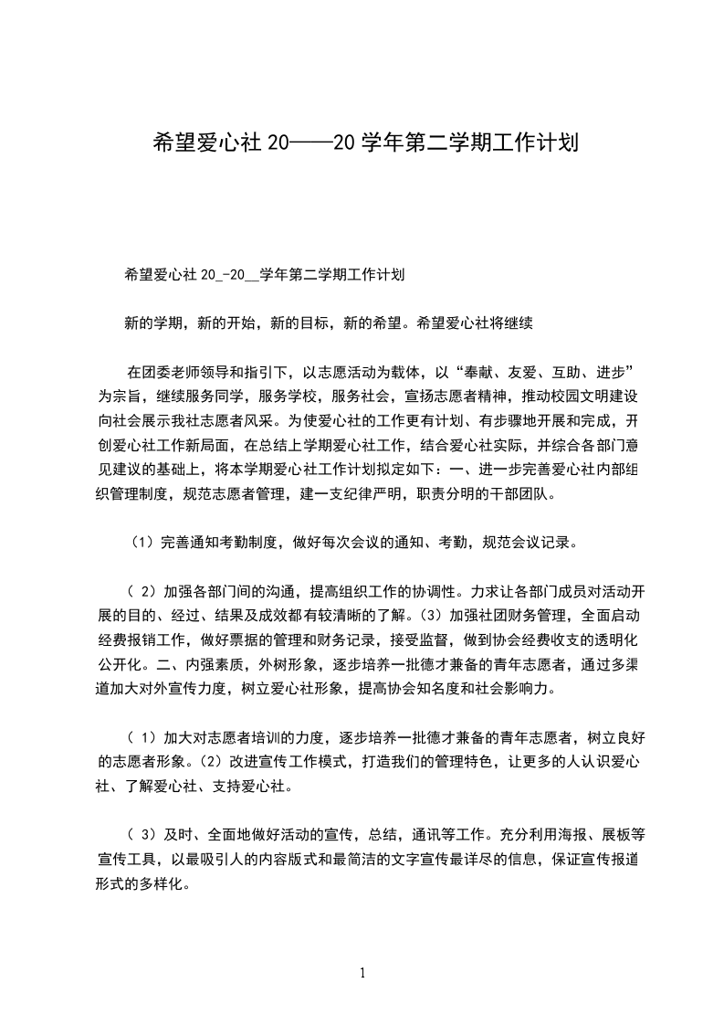 在团委老师领导和指引下,以志愿活动为载体,以“奉献、友爱、互助、进步”为宗旨,继续服务同学,服务学校,服务社会,宣扬志愿者精神,推动校园文明建设,向社会展示我社志愿者风采。为使爱心社的工作更有计划、有步骤地开展和完成,开创爱心社工作新局面,在总结上学期爱心社工作,结合爱心社实际,并综合各部门意见建议的基础上,将本学期爱心社工作计划拟定如下:一、进一步完善爱心社内部组织管理制度,规范志愿者管理,建一支纪律严明,职责分明的干部团队。