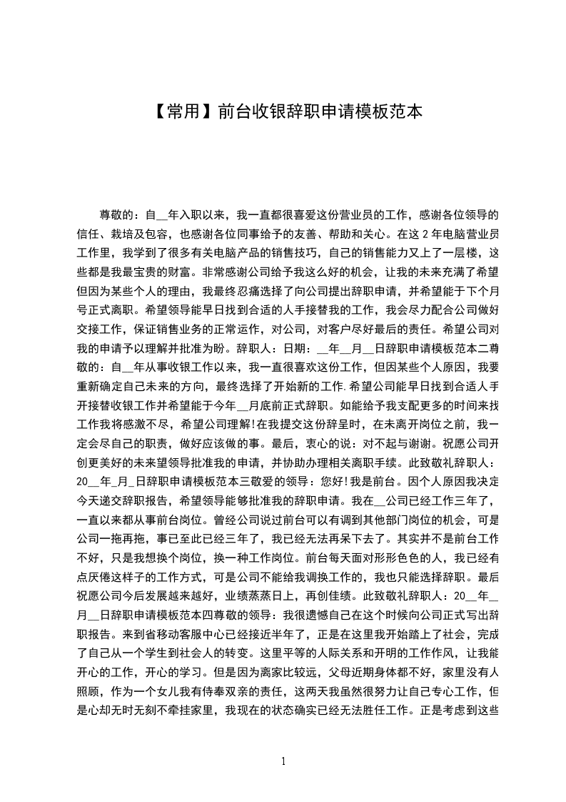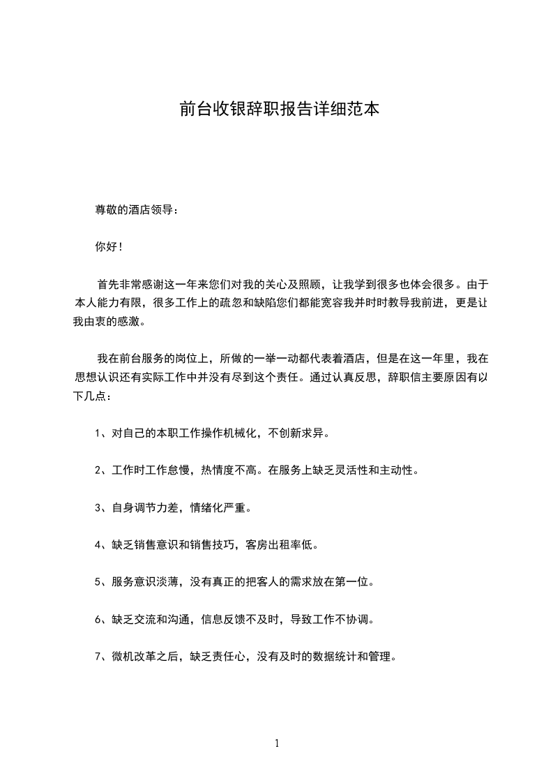 希望公司能早日找到合适人手开接替收银工作并希望能于今年__月底前正式辞职。如能给予我支配更多的时间来找工作我将感激不尽,希望公司理解!在我提交这份辞呈时,在未离开岗位之前,我一定会尽自己的职责,做好应该做的事。