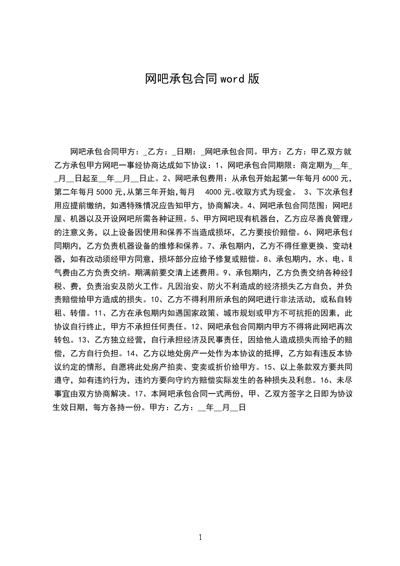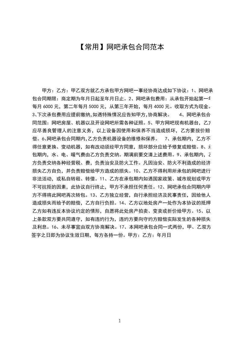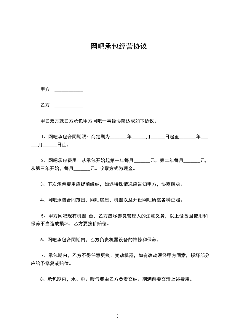 甲乙双方就乙方承包甲方网吧一事经协商达成如下协议: