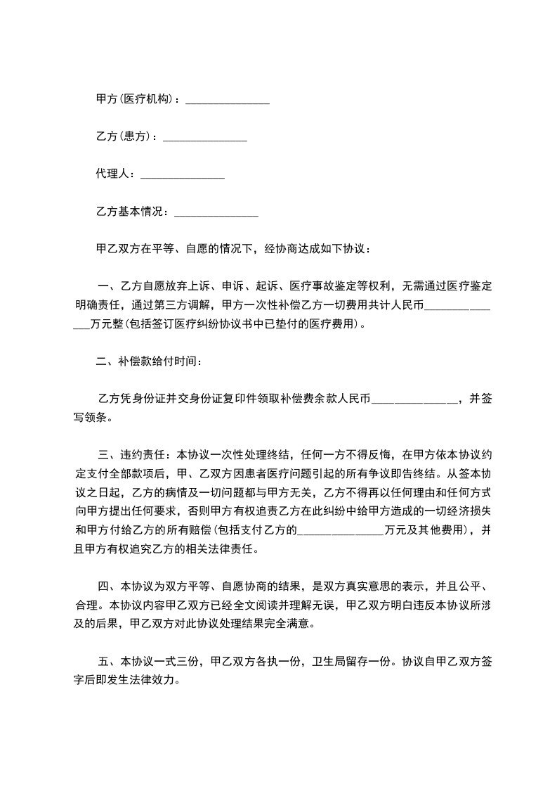 一、乙方自愿放弃上诉、申诉、起诉、医疗事故鉴定等权利,无需通过医疗鉴定明确责任,通过第三方调解,甲方一次性补偿乙方一切费用共计人民币_______________万元整(包括签订医疗纠纷协议书中已垫付的医疗费用)。