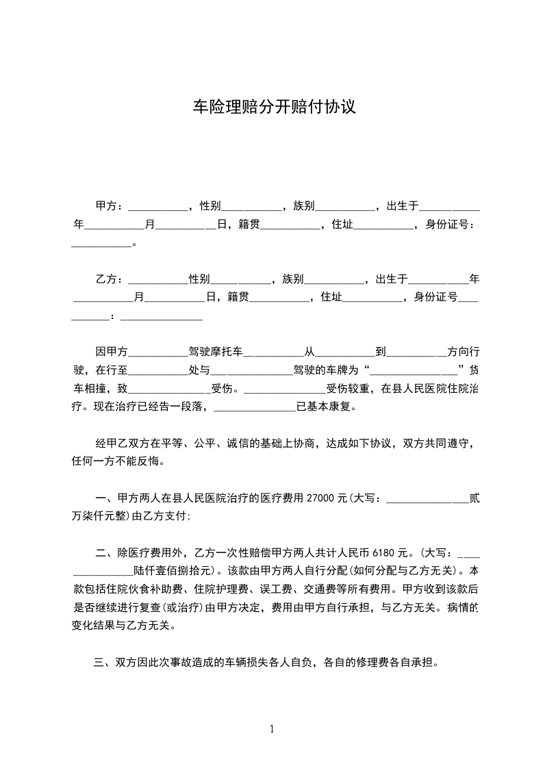 一、甲方两人在县人民医院治疗的医疗费用27000元(大写:_______________贰万柒仟元整)由乙方支付;