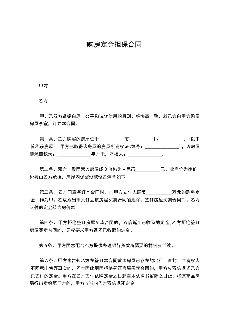 第三条、乙方同意签订本合同时,向甲方支付人民币___________万元的购房定金,作为甲、乙双方当事人订立该房屋买卖合同的担保,签订房屋买卖合同后,乙方支付的定金转为房价款。