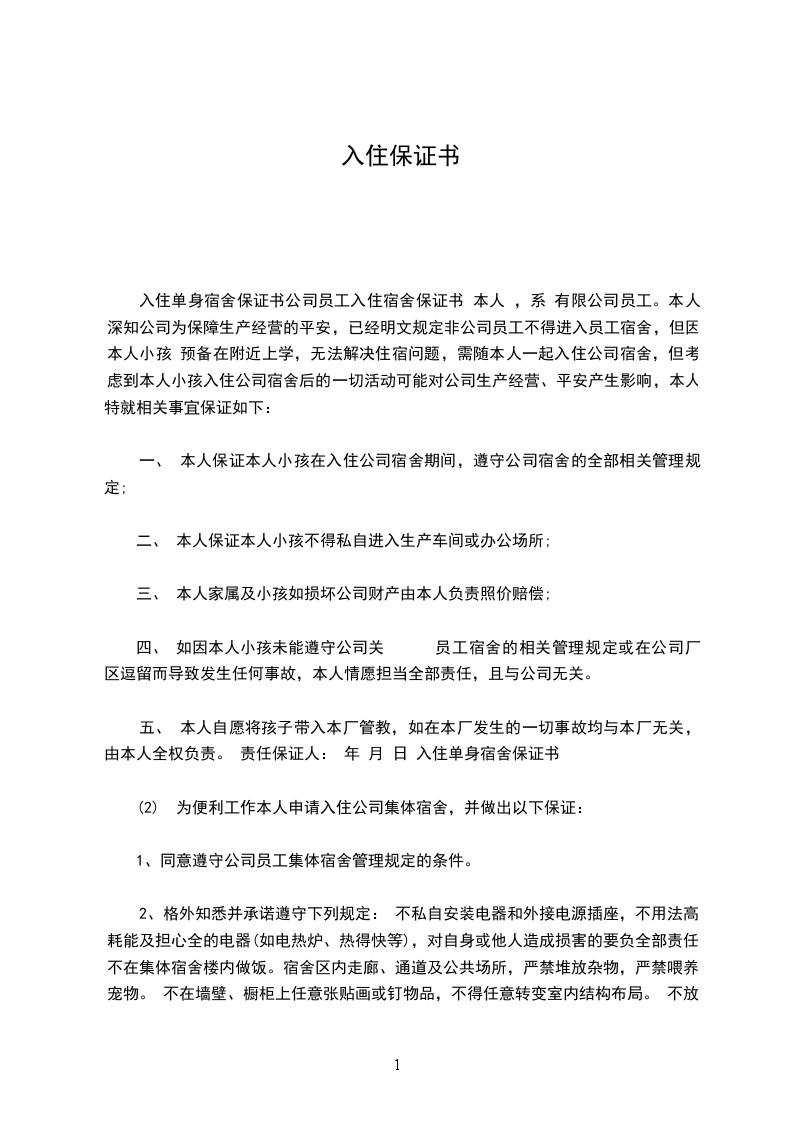 本人,系合生实业有限公司员工。本人深知公司为保障生产经营的安全,已经明文规定非公司员工不得进入员工宿舍,但因本人小孩()准备在附近上学,无法解决住宿问题,需随本人一起入住公司宿舍,但考虑到本人小孩入住公司宿舍后的一切活动可能对公司生产经营、安全产生影响,本人特就相关事宜保证如下: