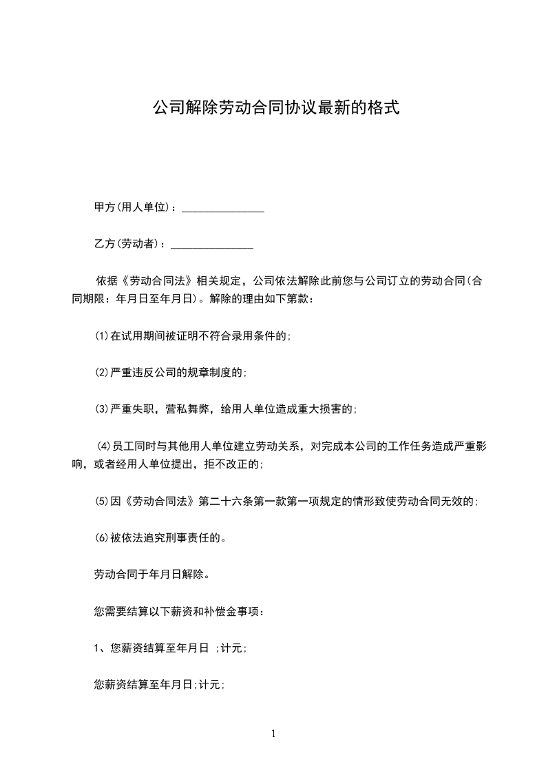 1、自_____________年__________月__________日起,解除双方签订的劳动合同,双方的权利义务随之终止;