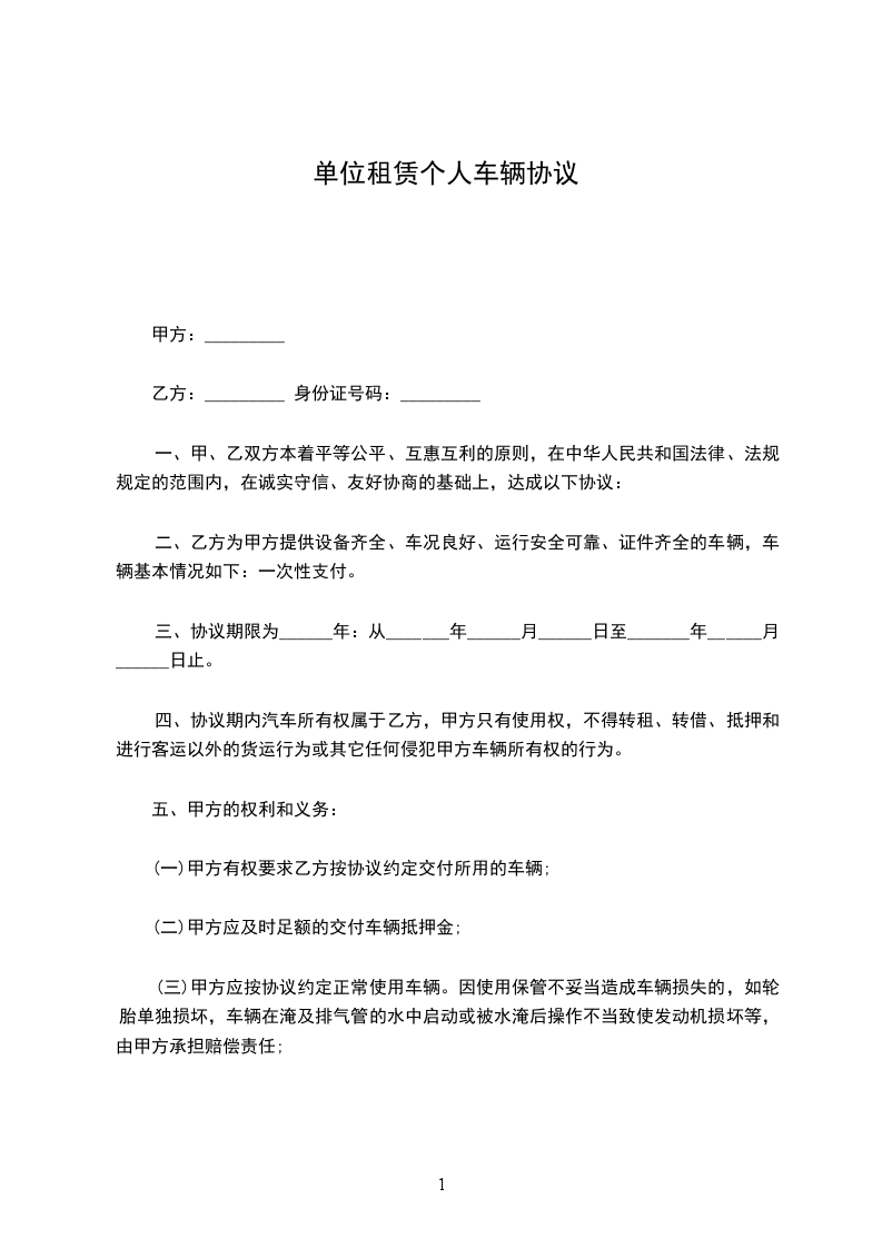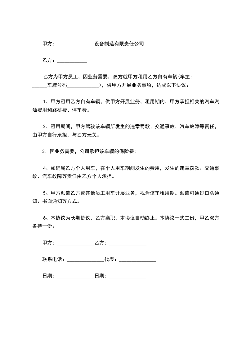 乙方为甲方员工,因业务需要,双方就甲方租用乙方自有车辆(车主:_______________车牌号码_____________),供甲方开展业务事项,达成以下协议: