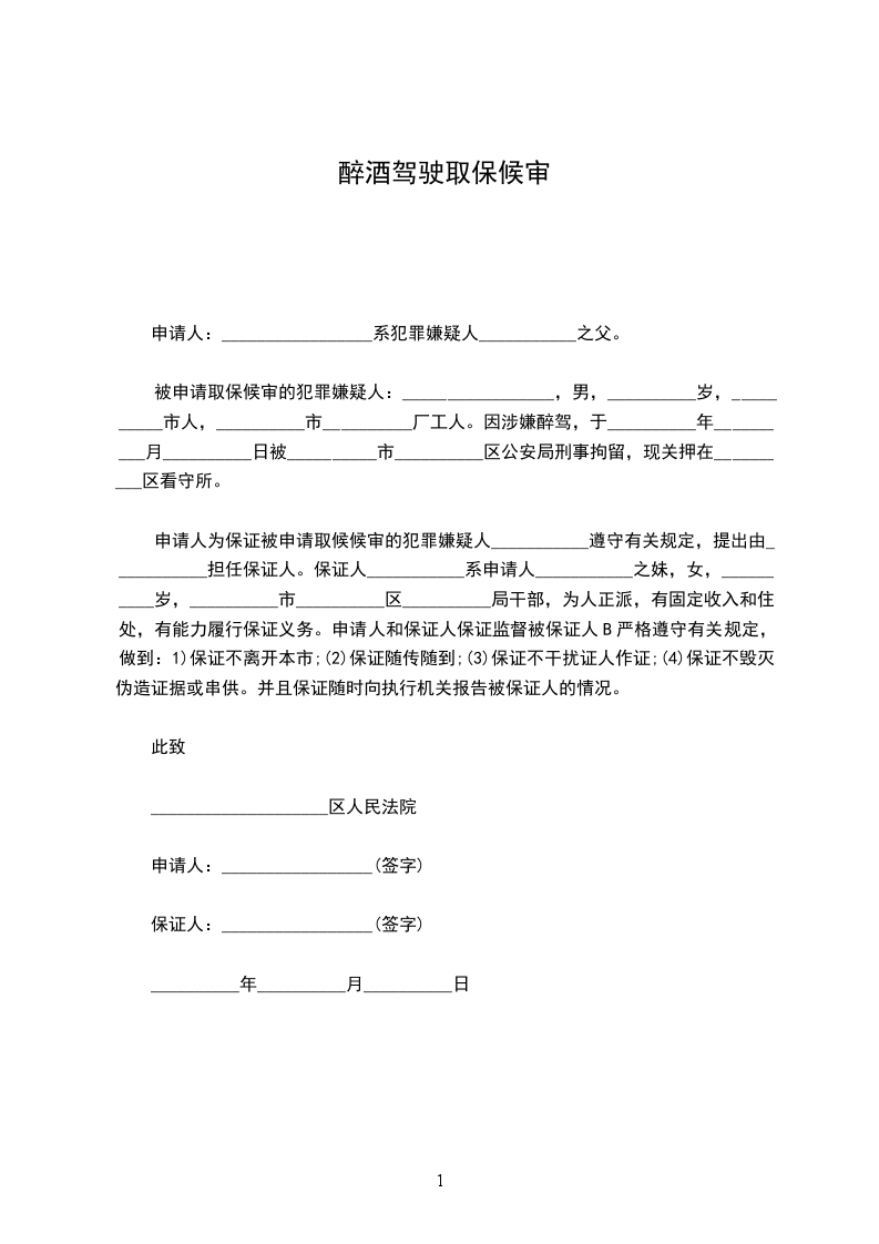 被申请取保候审的犯罪嫌疑人:_________________,男,__________岁,__________市人,__________市__________厂工人。因涉嫌醉驾,于__________年__________月__________日被__________市__________区公安局刑事拘留,现关押在__________区看守所。