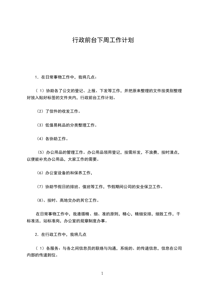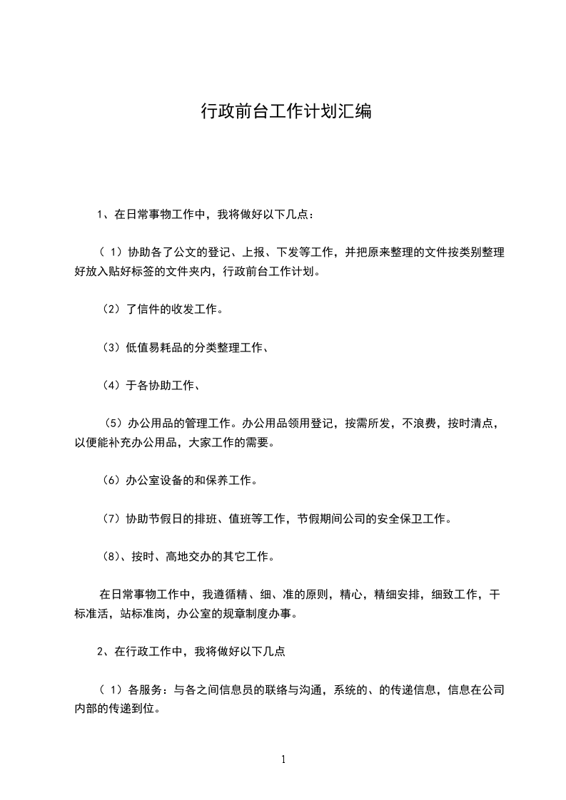 行政前台工作计划范文篇三: