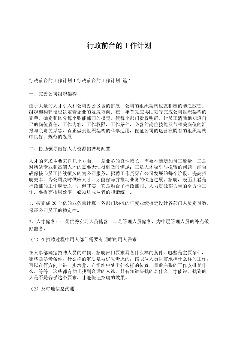 行政前台工作计划范文篇二: