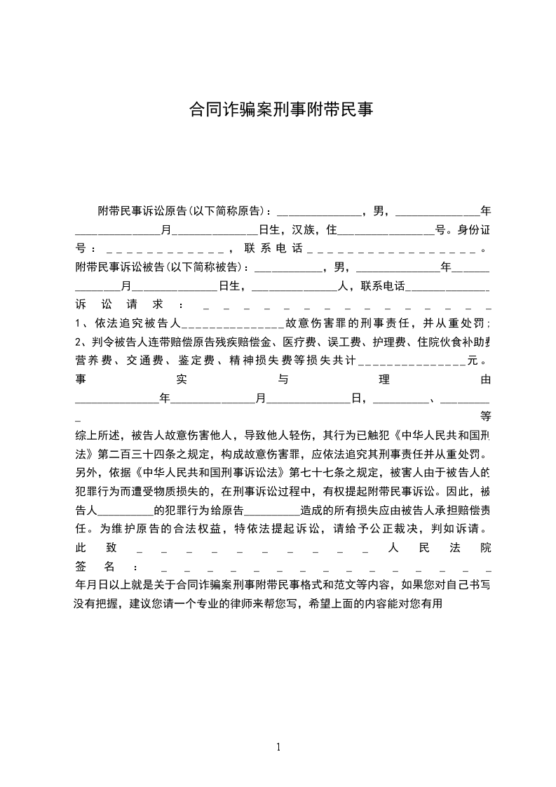 _____年_____月_____日以上就是关于合同诈骗案刑事附带民事格式和范文等内容,如果您对自己书写没有把握,建议您请一个专业的律师来帮您写,希望上面的内容能对您有用