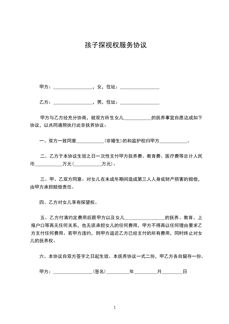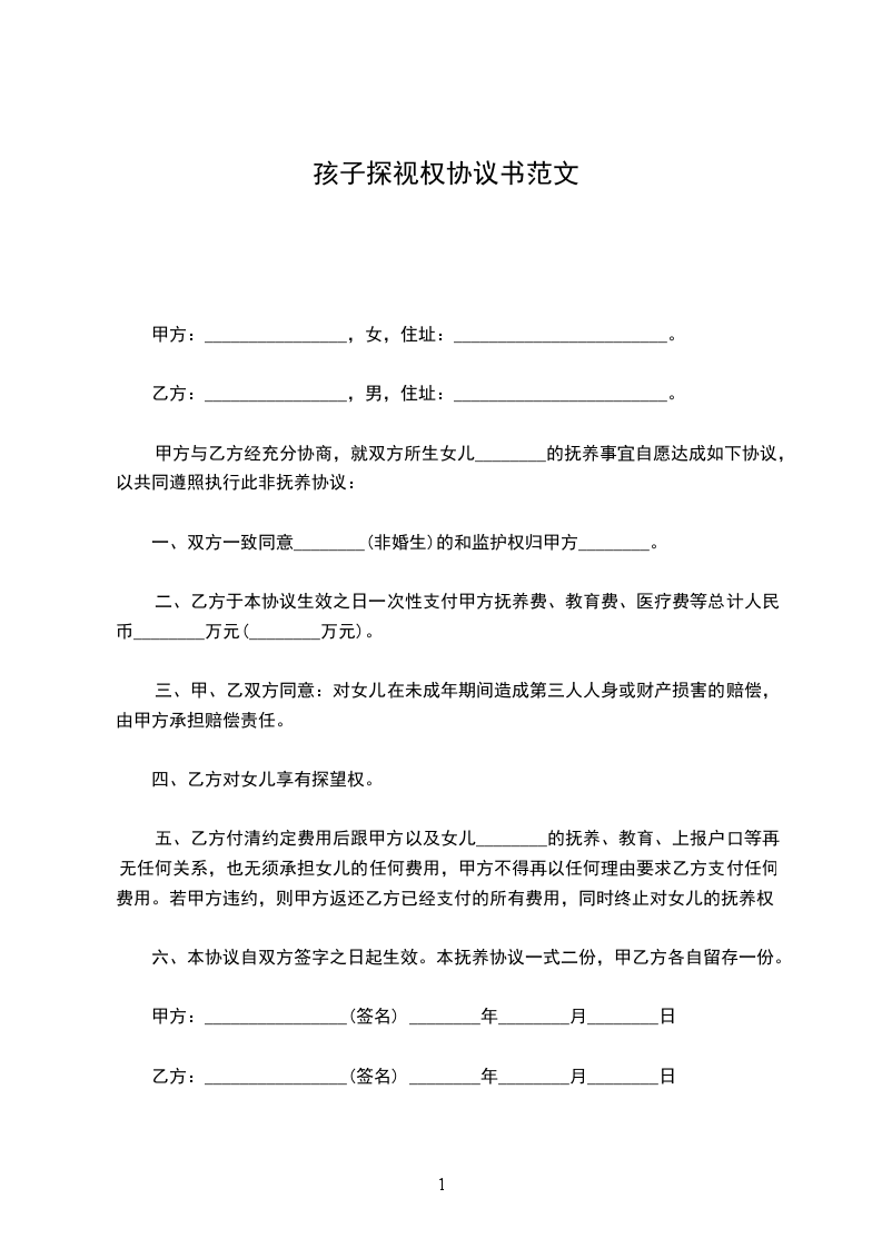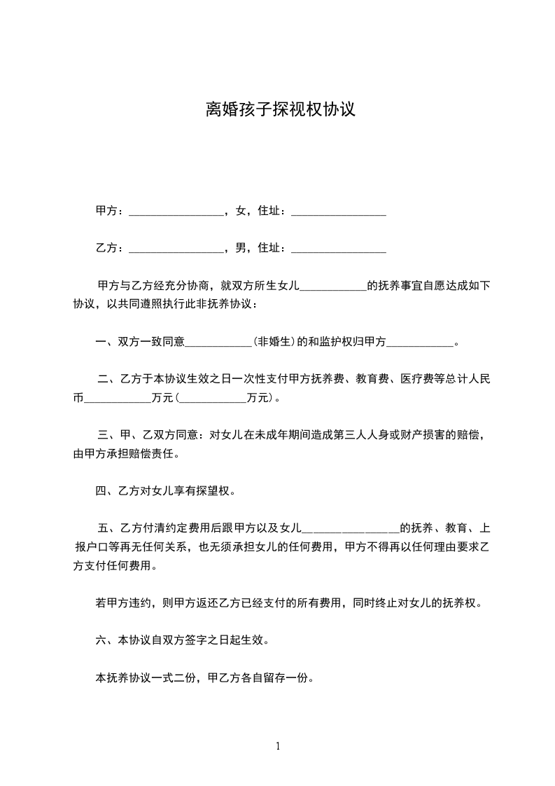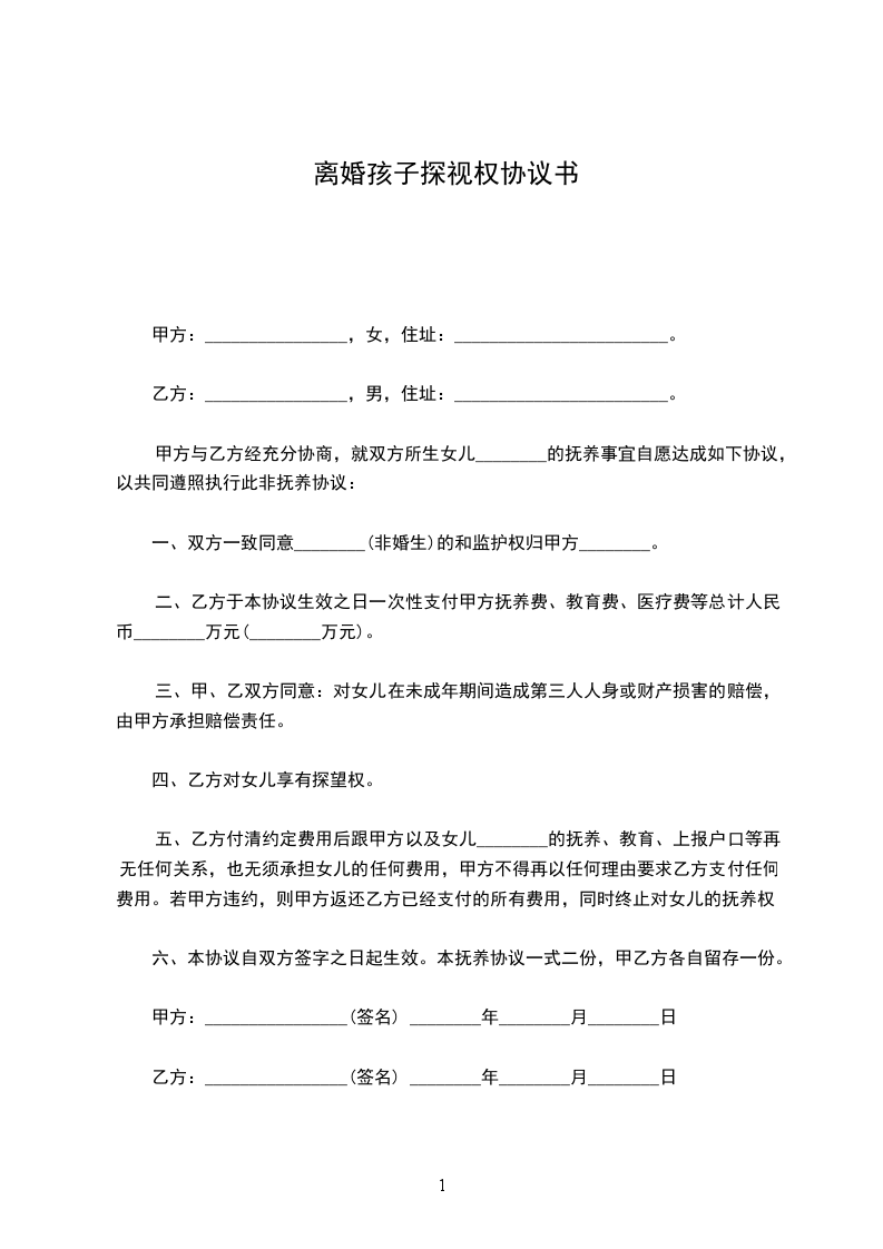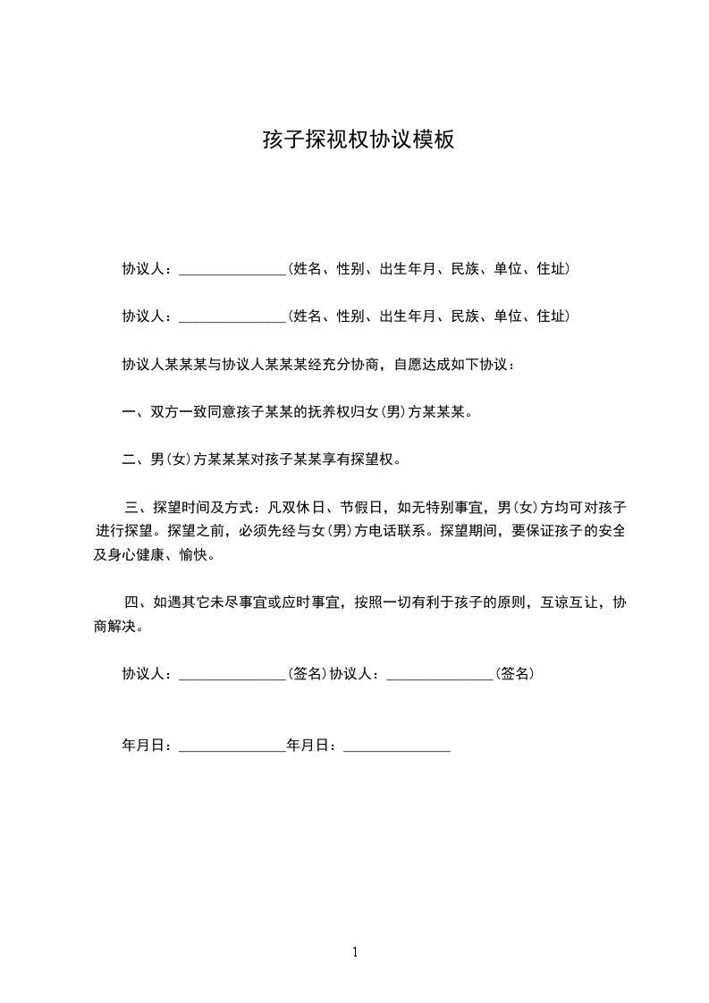 三、探望时间及方式:凡双休日、节假日,如无特别事宜,男(女)方均可对孩子进行探望。探望之前,必须先经与女(男)方电话联系。探望期间,要保证孩子的安全及身心健康、愉快。