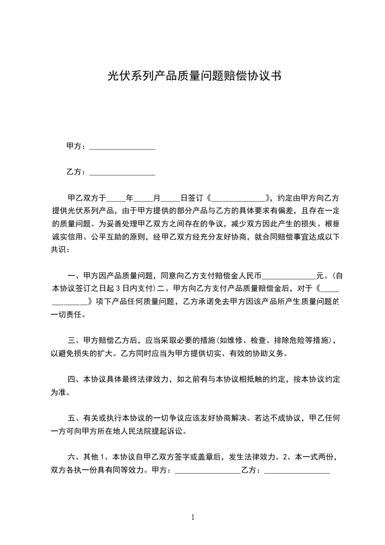 甲乙双方于_____年_____月_____日签订《》,约定由甲方向乙方提供光伏系列产品,由于甲方提供的部分产品与乙方的具体要求有偏差,且存在一定的质量问题。为妥善处理甲乙双方之间存在的争议,减少双方因此产生的损失。根据诚实信用、公平互助的原则,经甲乙双方经充分友好协商,就合同赔偿事宜达成以下共识: