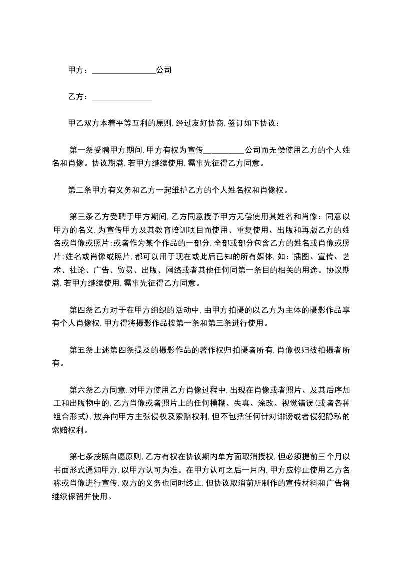 第一条受聘甲方期间,甲方有权为宣传__________公司而无偿使用乙方的个人姓名和肖像。协议期满,若甲方继续使用,需事先征得乙方同意。