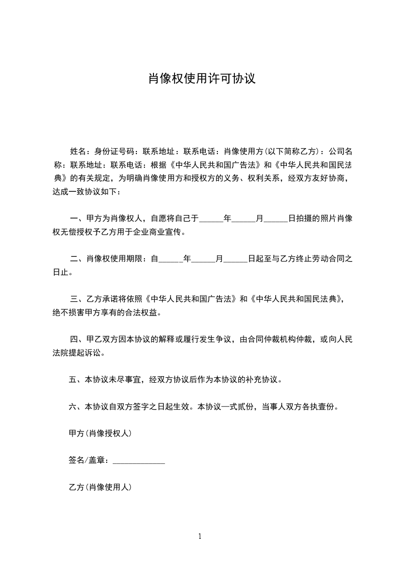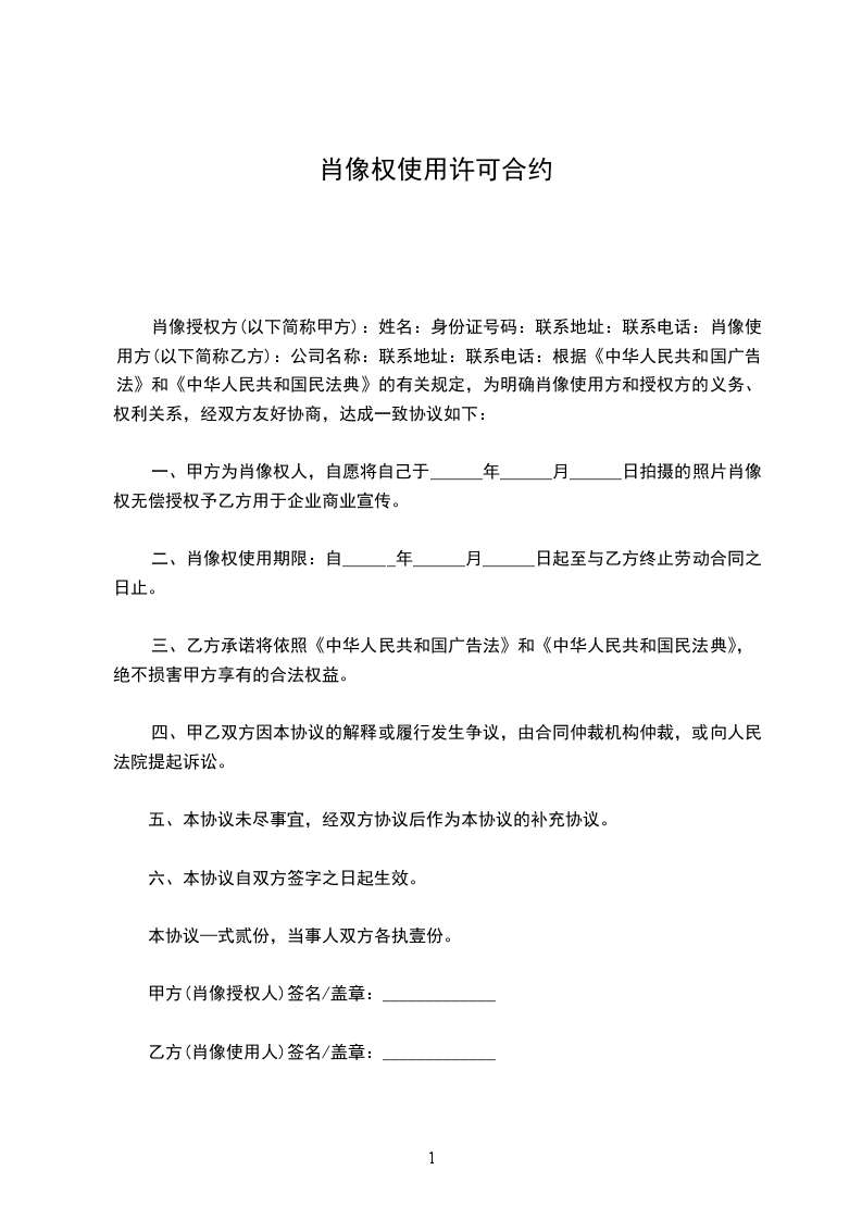 第八条甲方在与乙方其解除劳动/劳务/聘用关系解除后的一年内可以无条件使用乙方的肖像权和姓名权。第九条本协议书一式二份,甲、乙双方各执一份。