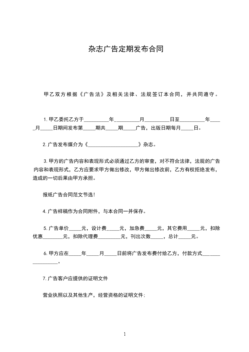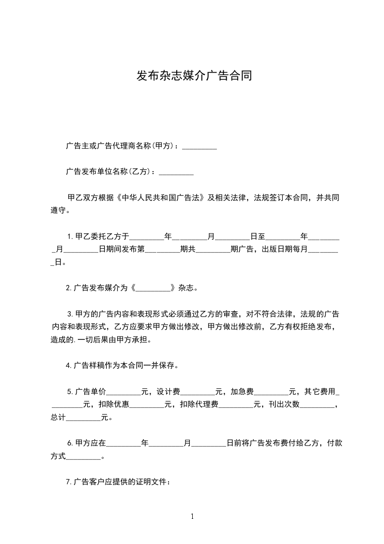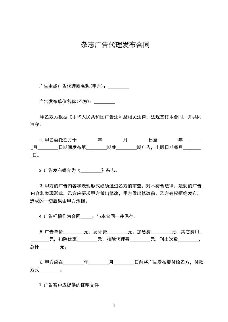 1.甲方委托乙方于____年____月____日至____年____月____日期间在__________杂志发布标题为____________广告。广告规格为____________。广告单价____ 元,加急费____ 元,其他费用_______元,扣除优惠__________元,刊登次数____。总计______元,大写____________。