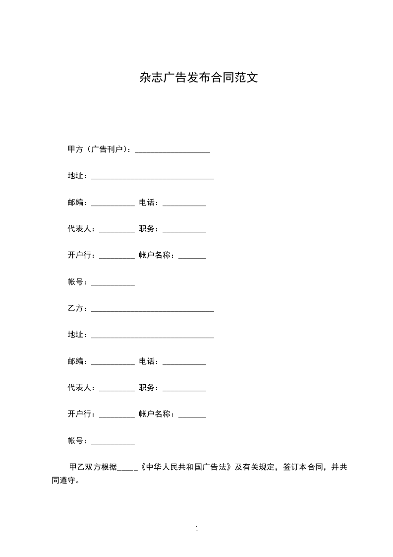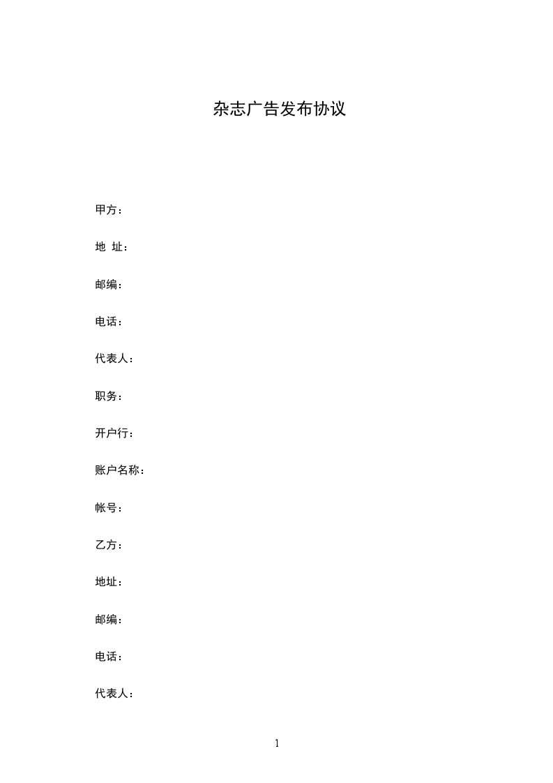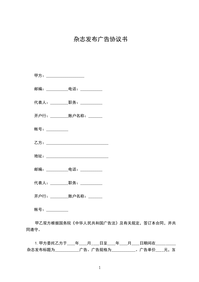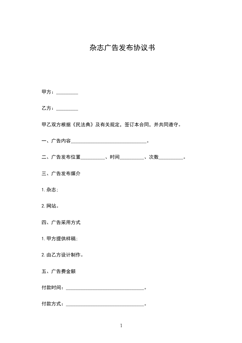 1.甲方委托乙方于____年____月____日至____年____月____日期间在__________杂志发布标题为____________广告。广告规格为____________。广告单价____ 元,加急费____ 元,其他费用_______元,扣除优惠__________元,刊登次数____。总计______元,大写____________。